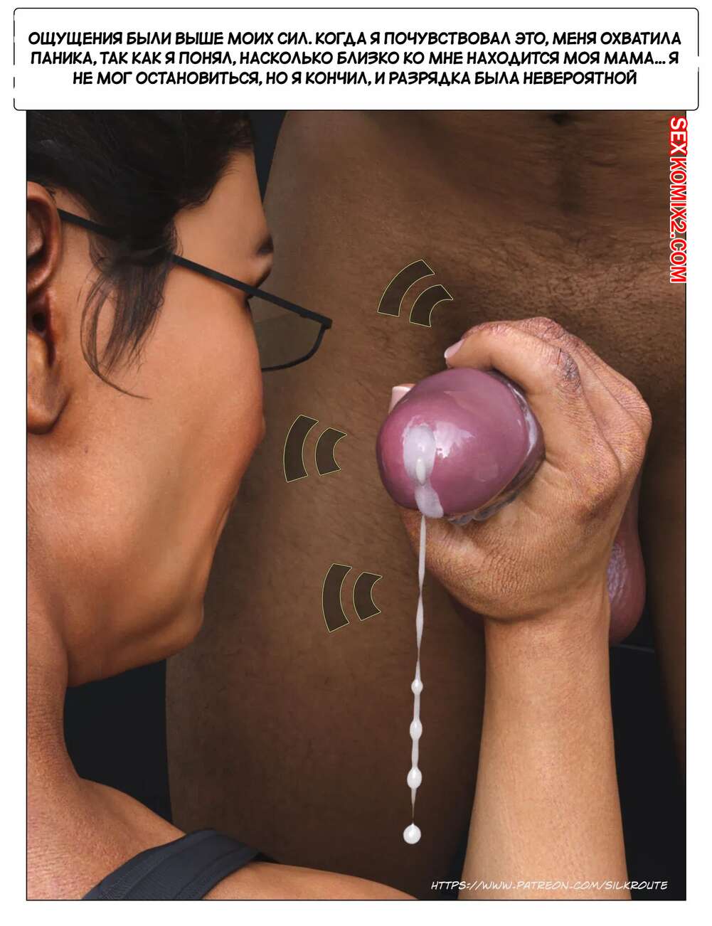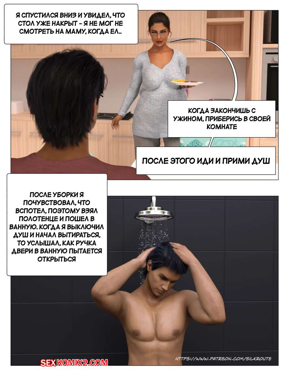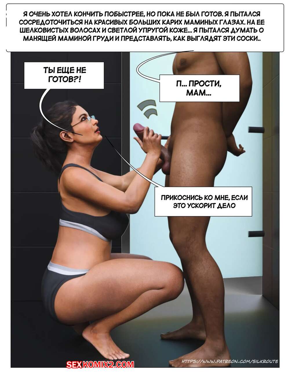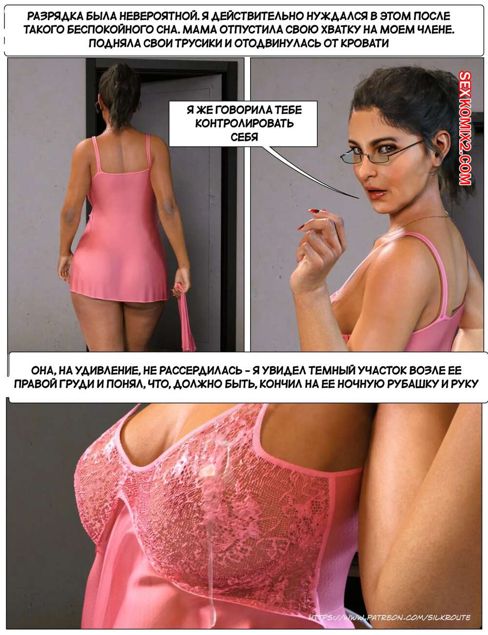Порно комикс Прошу, помоги мне расслабиться. Часть 3. Please Relieve Me. Silk Route, Ira Raman У парня снова заболел член, когда он принимал душ, так что его мамочка сразу пришла к нему на помощь. Милфа встала на колени и стала дрочить хуй сына, от чего он быстро кончил.