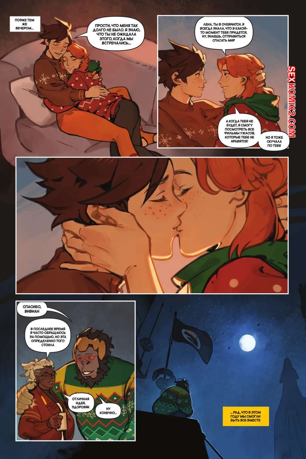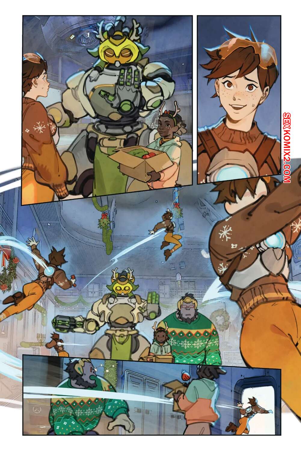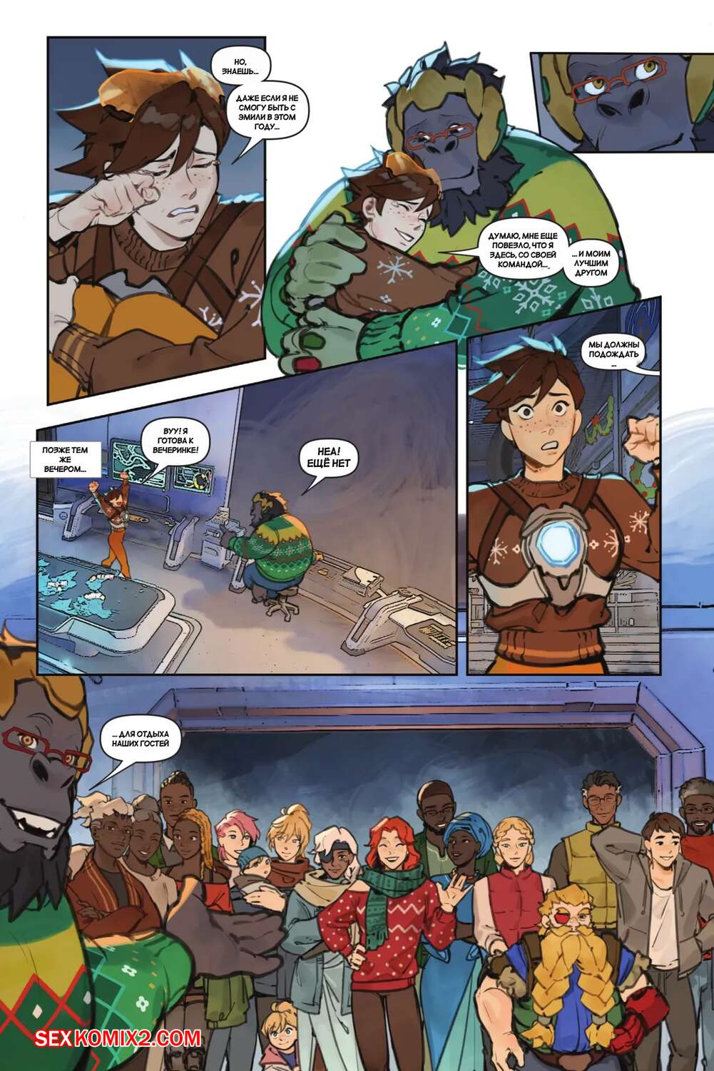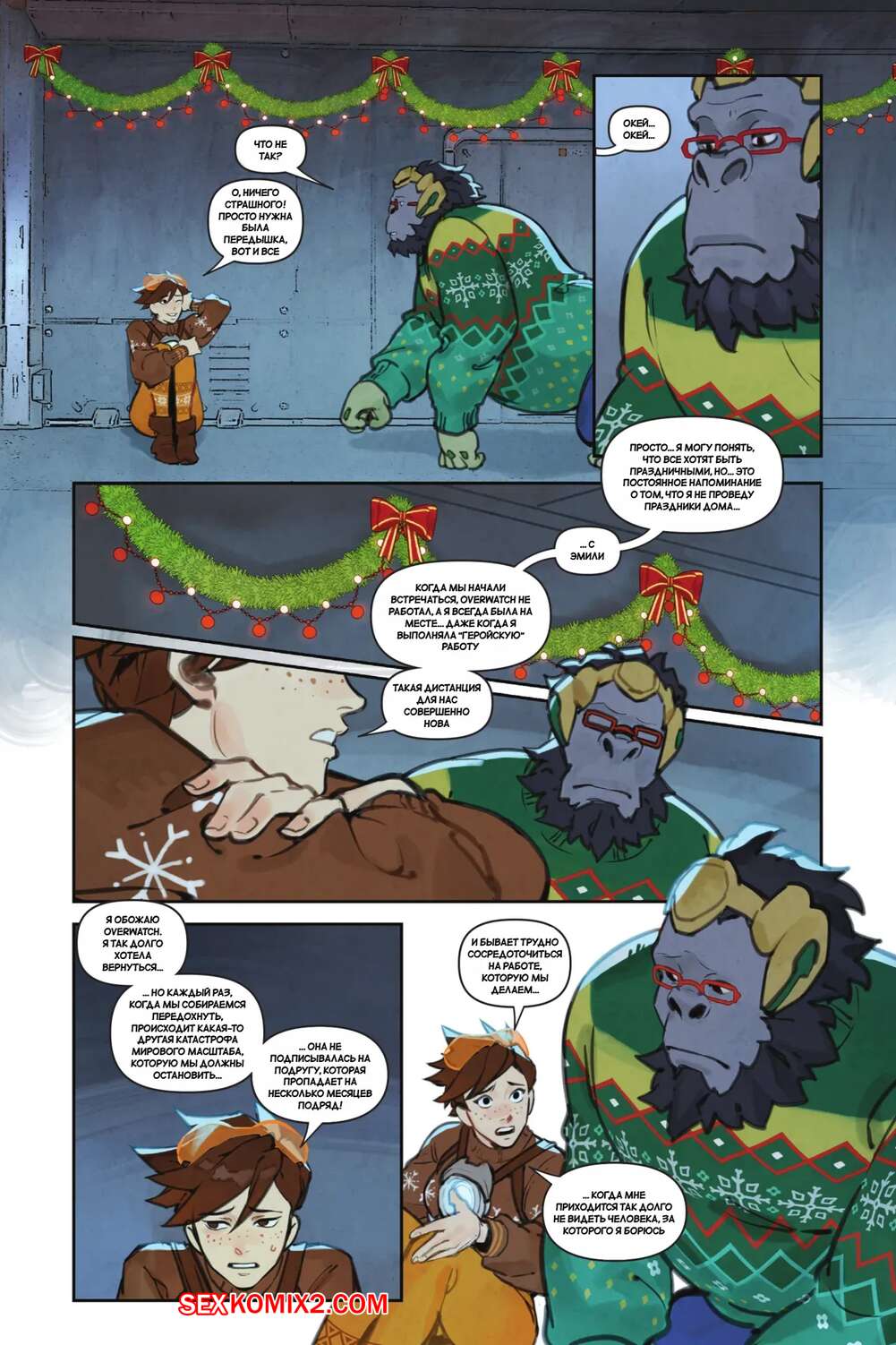 Порно комикс Overwatch. Вместе. Together. Sam King, Velinxi. На базе все готовяться украшением и подготовкой к Рождеству, только Трейсер занята другими делами. Наконец друзья смогли устроить праздник, после чего все отправились по своим комнатам.