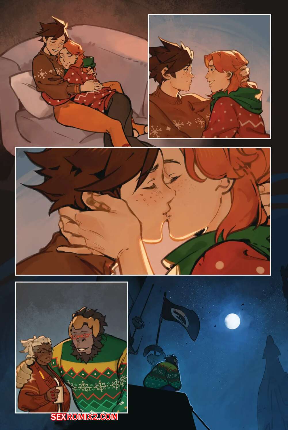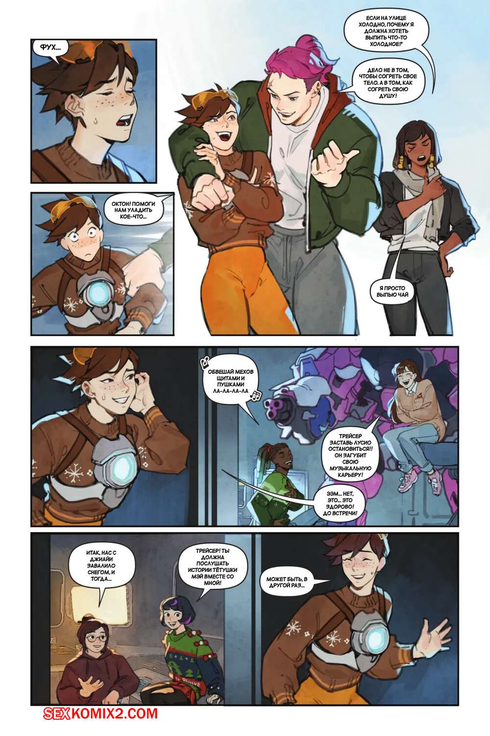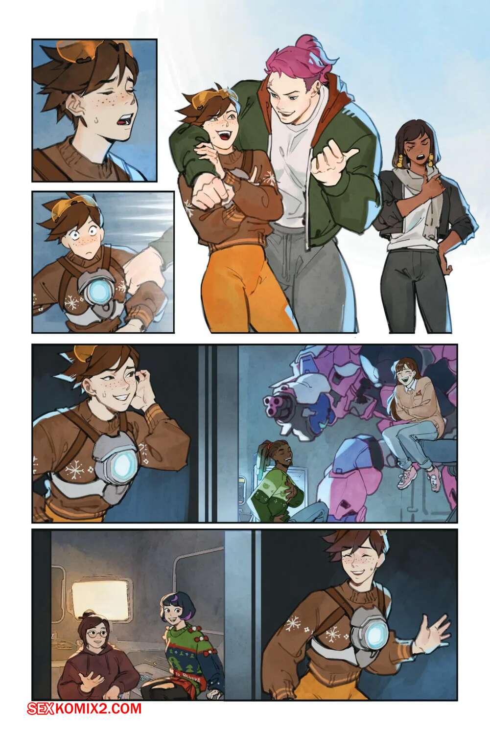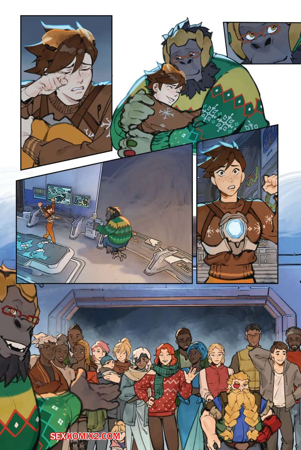 Порно комикс Overwatch. Вместе. Together. Sam King, Velinxi. На базе все готовяться украшением и подготовкой к Рождеству, только Трейсер занята другими делами. Наконец друзья смогли устроить праздник, после чего все отправились по своим комнатам.
