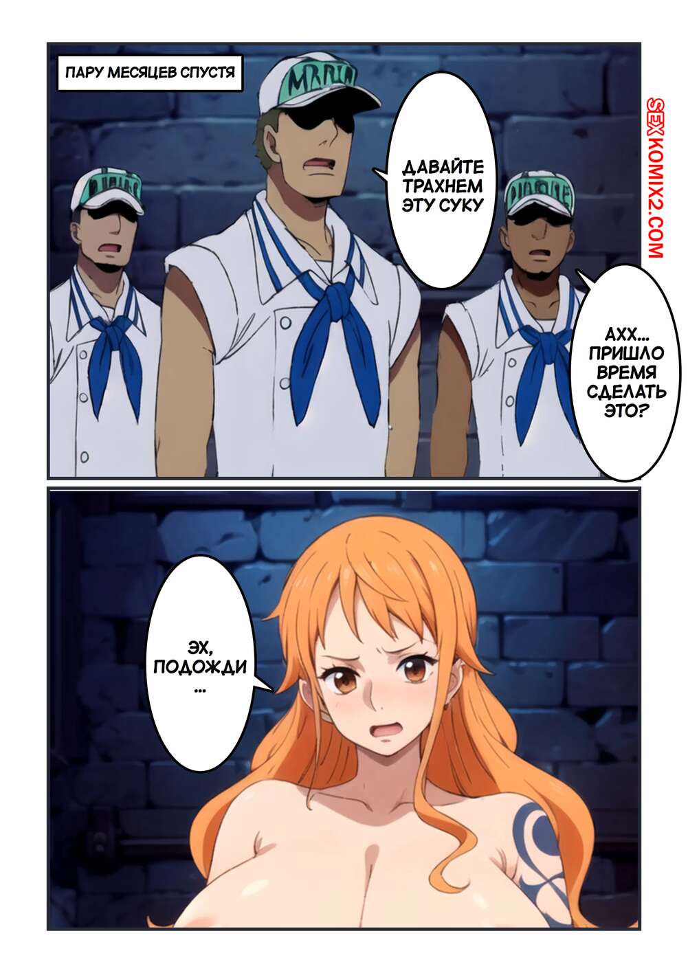 Порно комикс One Piece. Морская ловушка. Часть 2. Marine Trap. Kahoo Нами забеременела, но продолжает пребывать в тюрьме. К красотке пришла толпа парней, чтобы по очереди насладиться шикарным телом девушки и как следует ее выебать.