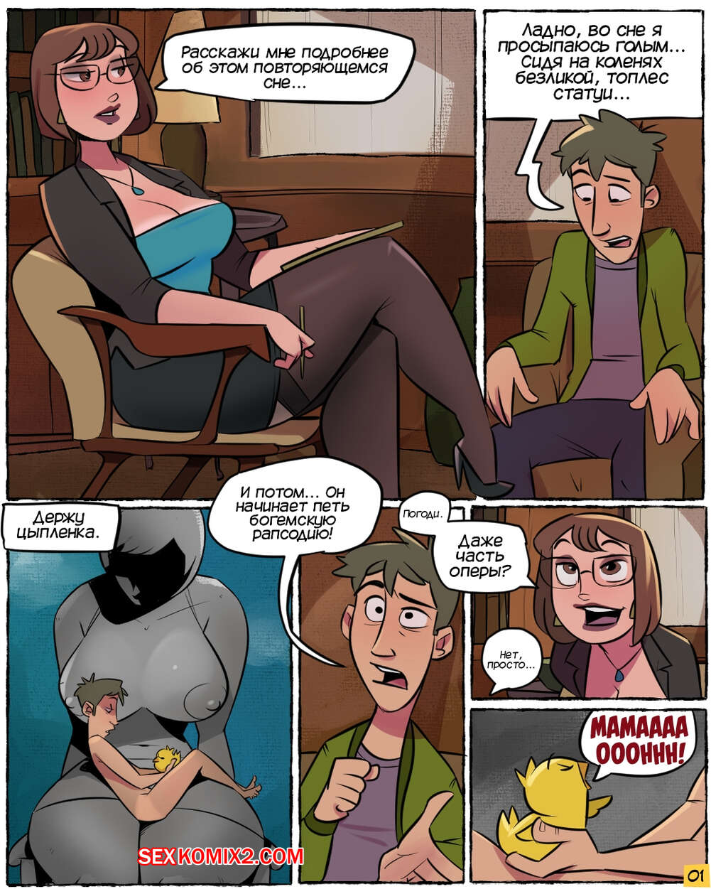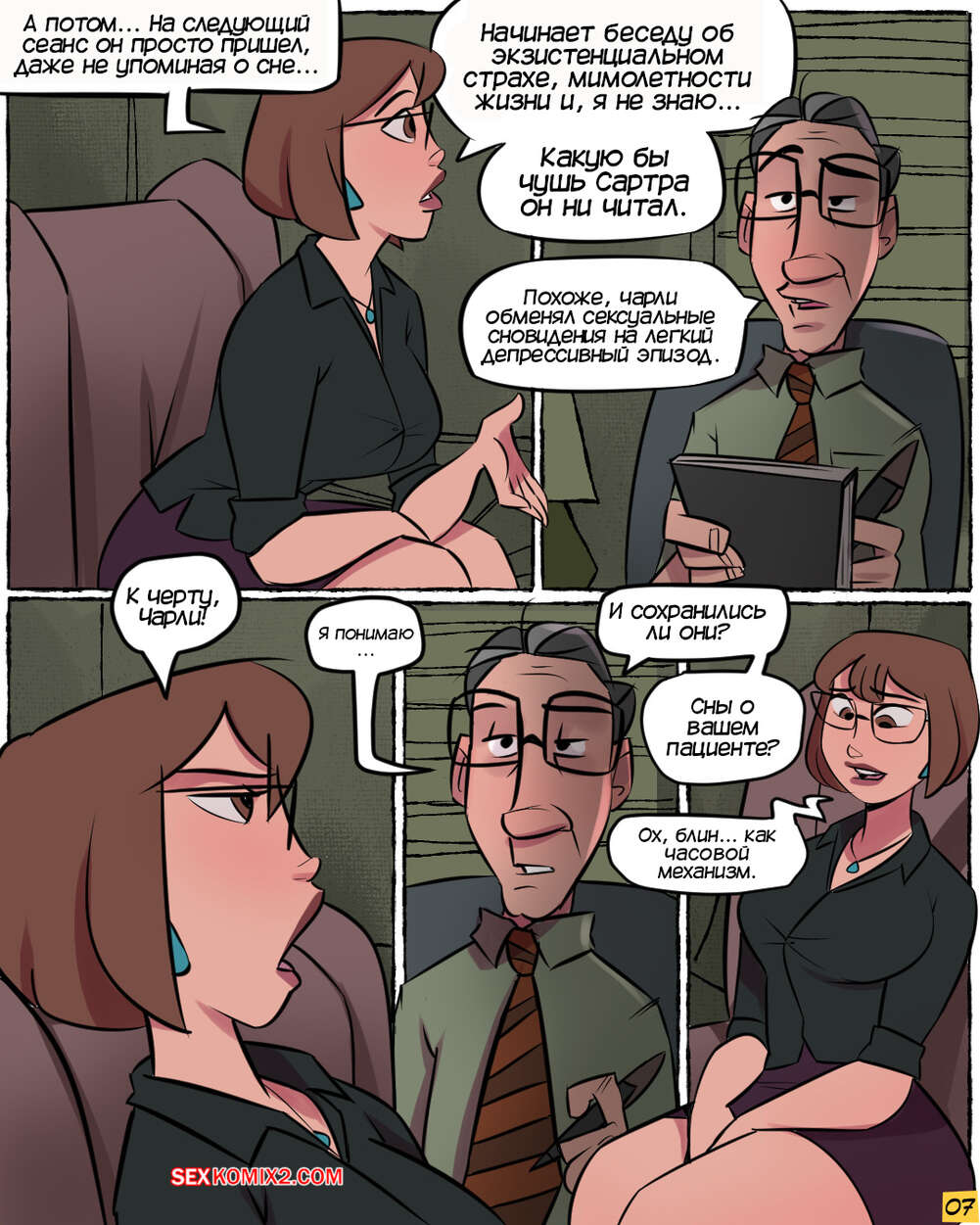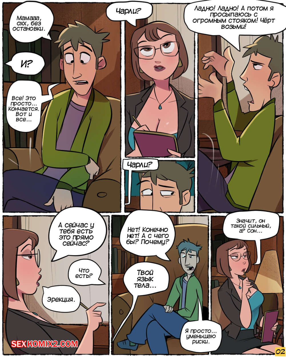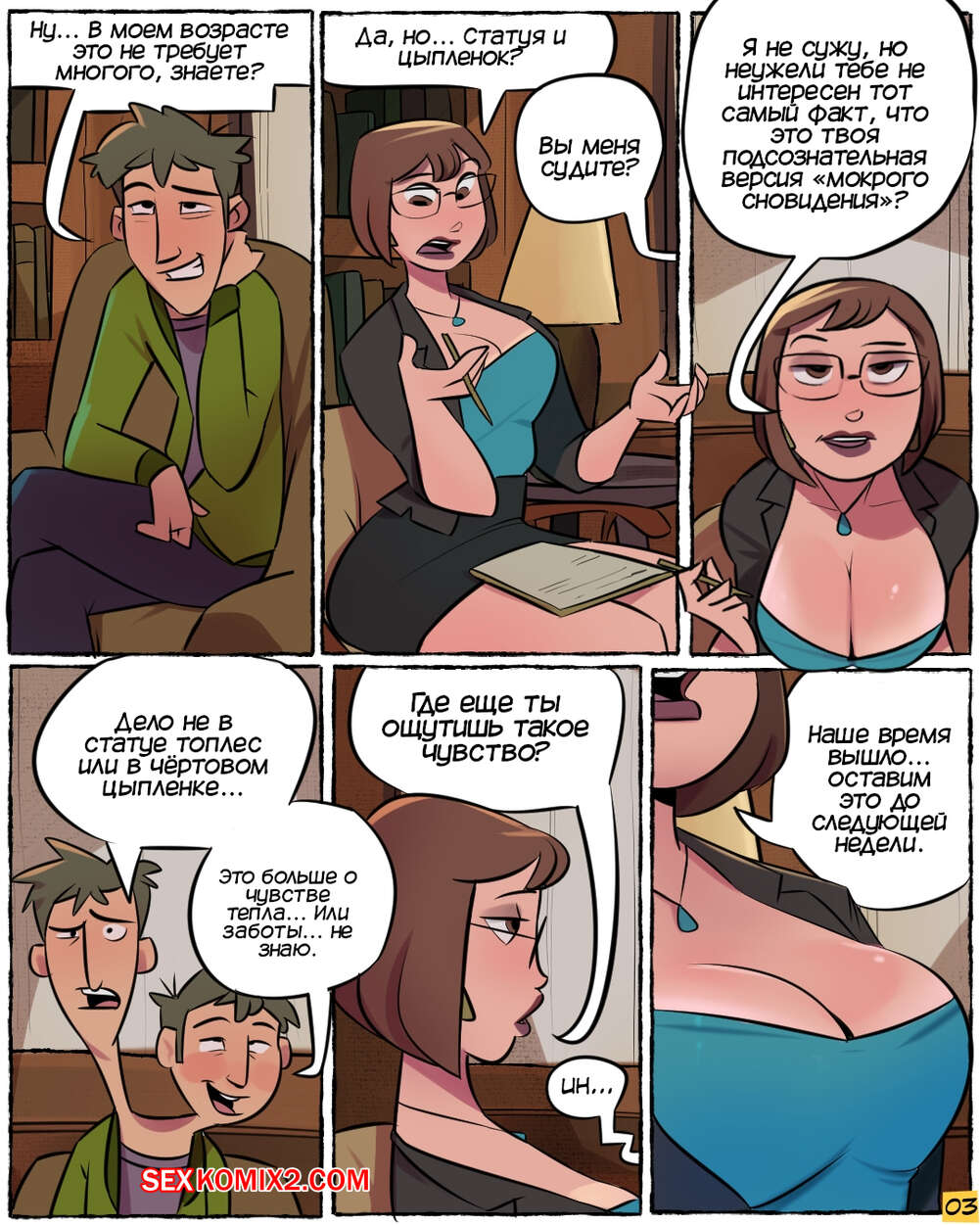 Порно комикс Нимфоманка София. NymphoSophia. Jmoz Молодой парень Чарли пришел на встречу со своим психологом Софией. Он рассказал горячей милфы о своем сексуальном сне, который регулярно ему снится, что очень заинтересовало красотку.