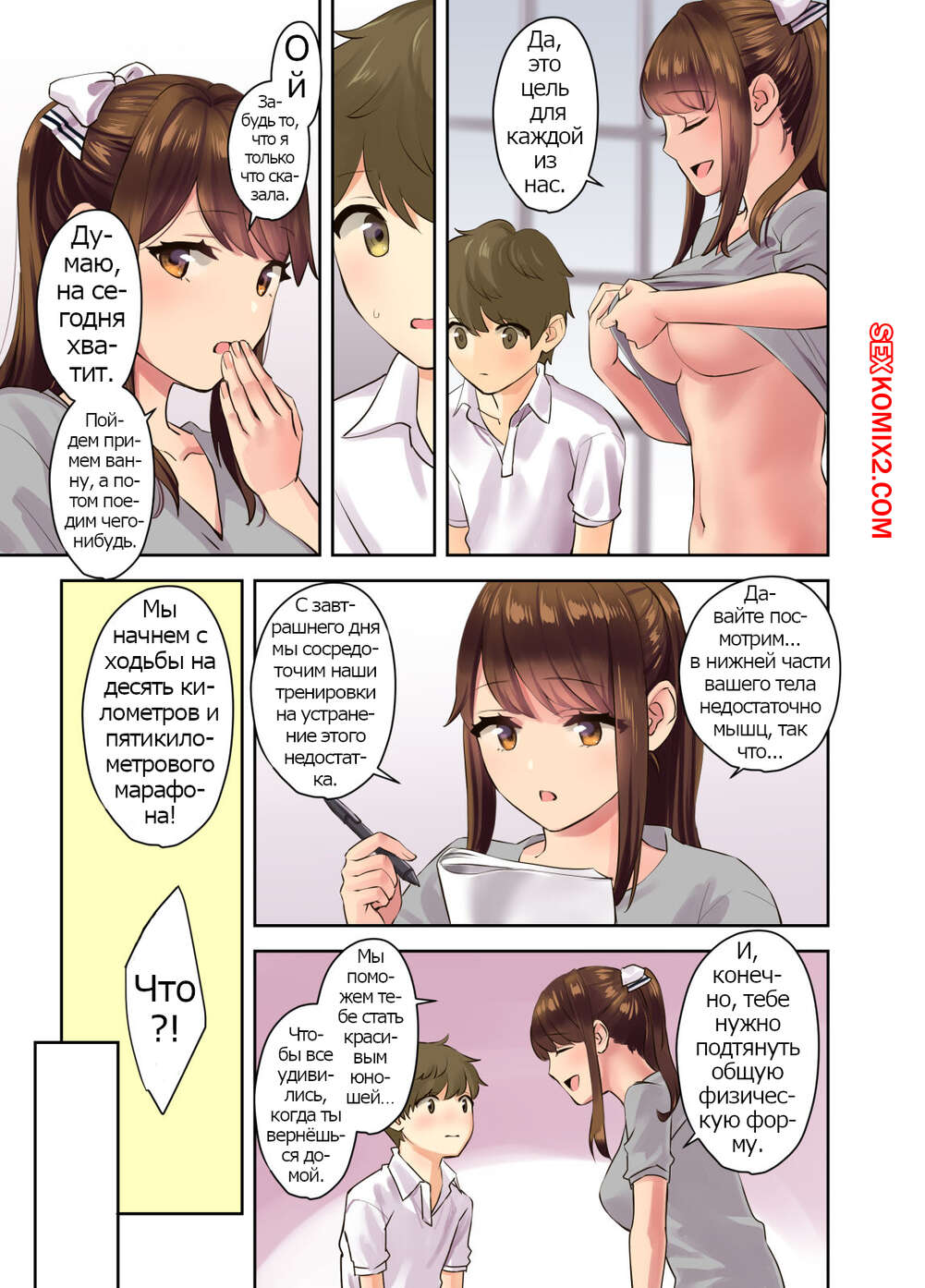 Порно комикс Спортивно тренировочный лагерь с зрелыми женщинами. Oshima Aki Молодой парень попал в спортивный лагерь, где его окружают горячие красотки с шикарными телами. Они соблазняют парня и сосут его большой член, после чего дают себя выебать.