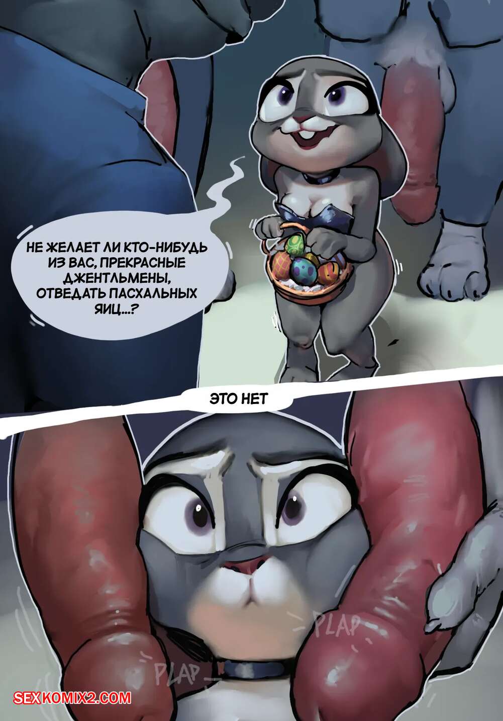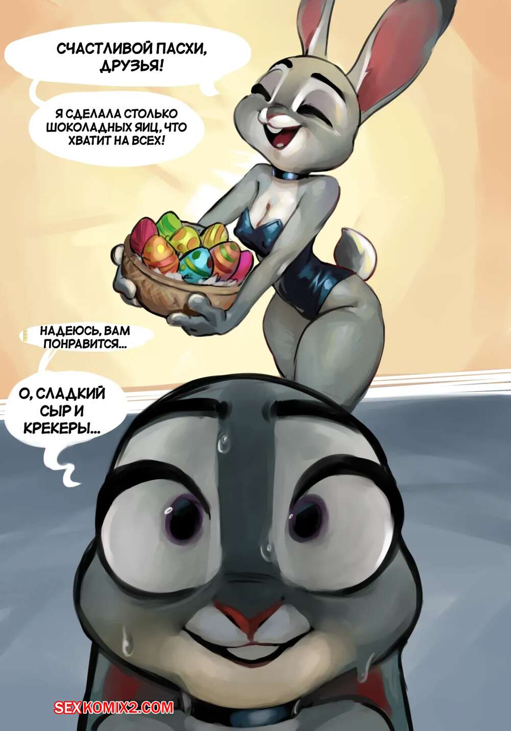 Порно комикс Зверополис. Пасха. Easter. Qupo. Горячая крольчиха привлекла внимание своих коллег шикарным телом. Они дали девушке отсосать свои большие хуи, после чего выебали ее во все дырочки, получив невероятное удовольствие.