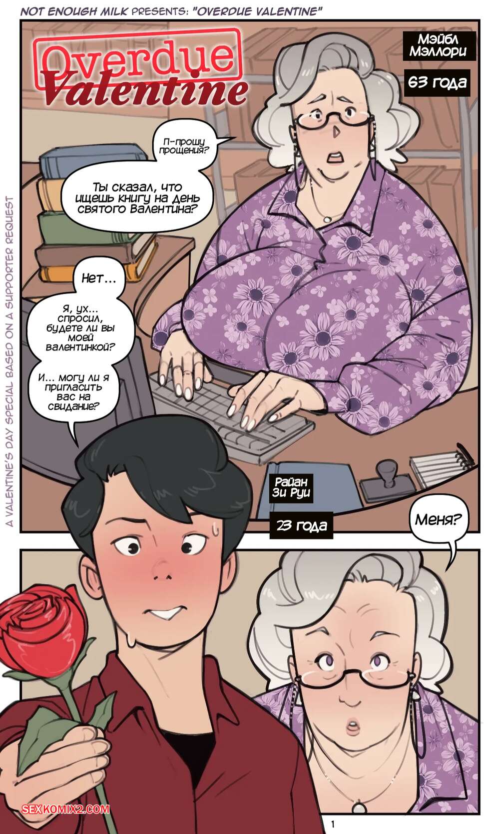 Порно комикс Просроченный Валентин. Overdue Valentine. NotEnoughMilk Юный парень влюблен в пожилую даму из библиотеки и наконец он набрался смелости, чтобы пригласить ее на свидание. Они вместе провели вечер, после чего парень проводил милфу до дома, где она дала ему себя трахнуть.