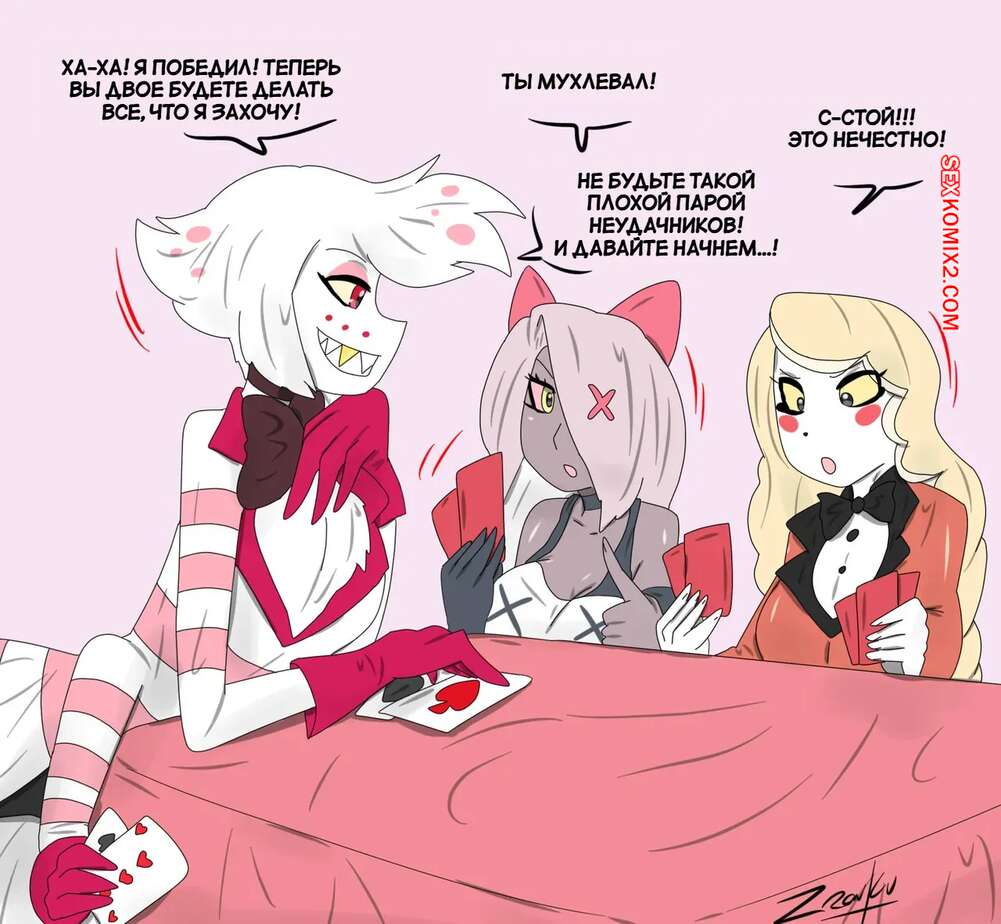 Порно комикс Отель Хазбин. Веселая сделка. Сексуальное откровение. Deal Fun. tikoriko. Два друга соблазняют горячих блондинок, желая повеселиться. Девушки разделись и отсосали большие хуи парней, после чего дали им себя хорошенько выебать.