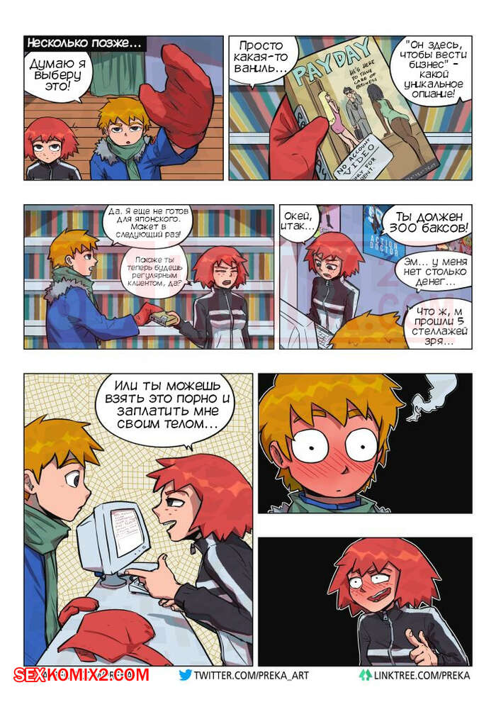 Порно комикс Скотт Пилигрим. День выплаты жалованья Ким Пайн. Preka. Девушка работает в прокате видеокассет, к ней пришел знакомы парень и он явно что-то скрывает. Оказывается он хотел взять в прокат порно, девушка решали ему помочь по другому решить его проблему.