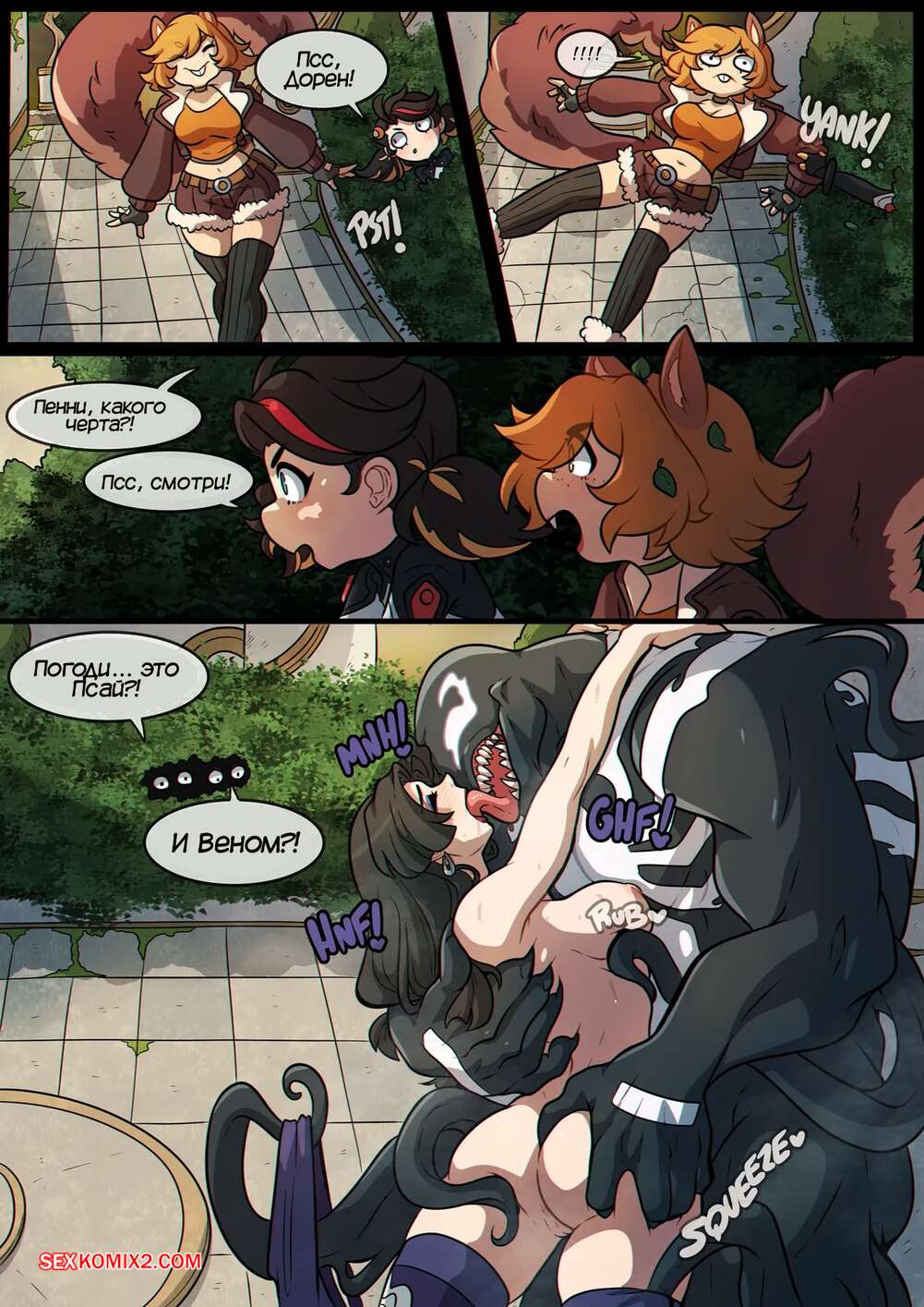 Порно комикс Marvel Rivals. Почему это так мило. Why is this Cute. Kinkymation Горячая красотка Псай уединилась с Веномом, чтобы повеселиться. Они занялись страстной нежной еблей с окончанием внутрь, пока две девушки наблюдали за ними из кустов.