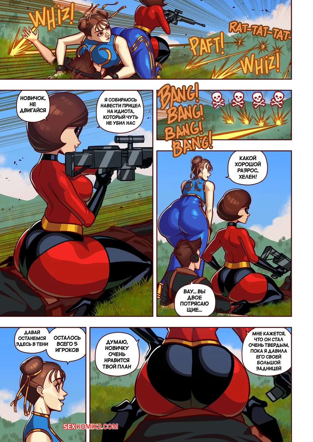 Порно комикс Fortnite. Королевский секс втроем. Threesome Royale. JERKdibuja. Парнишка оказался внутри игры, где встретил Чун Ли и Эластику. Красотки возбудили парня шикарными телами и отсосали его член, после чего дали ему себя выебать.