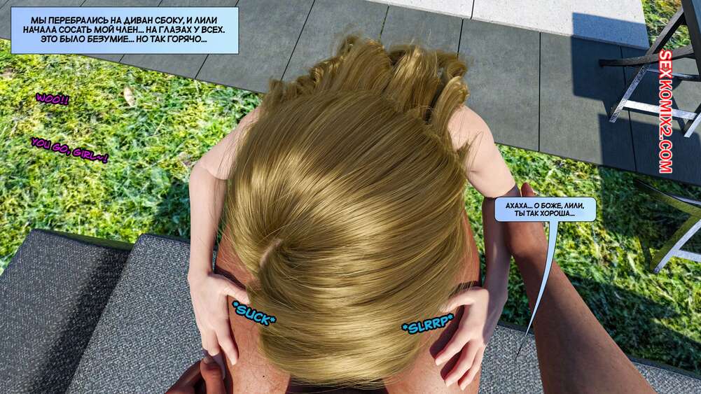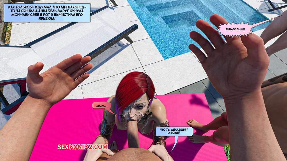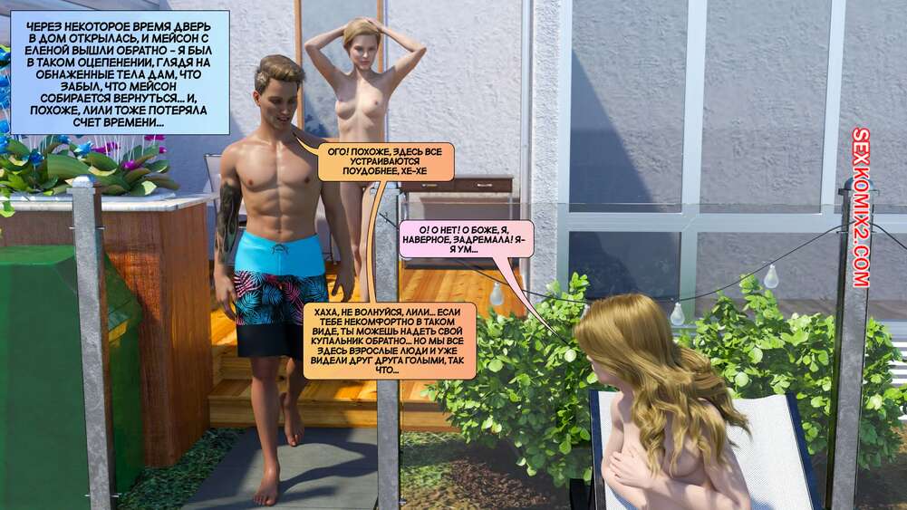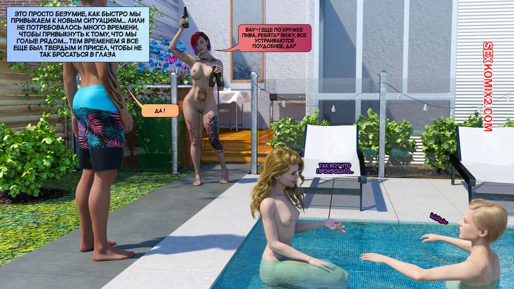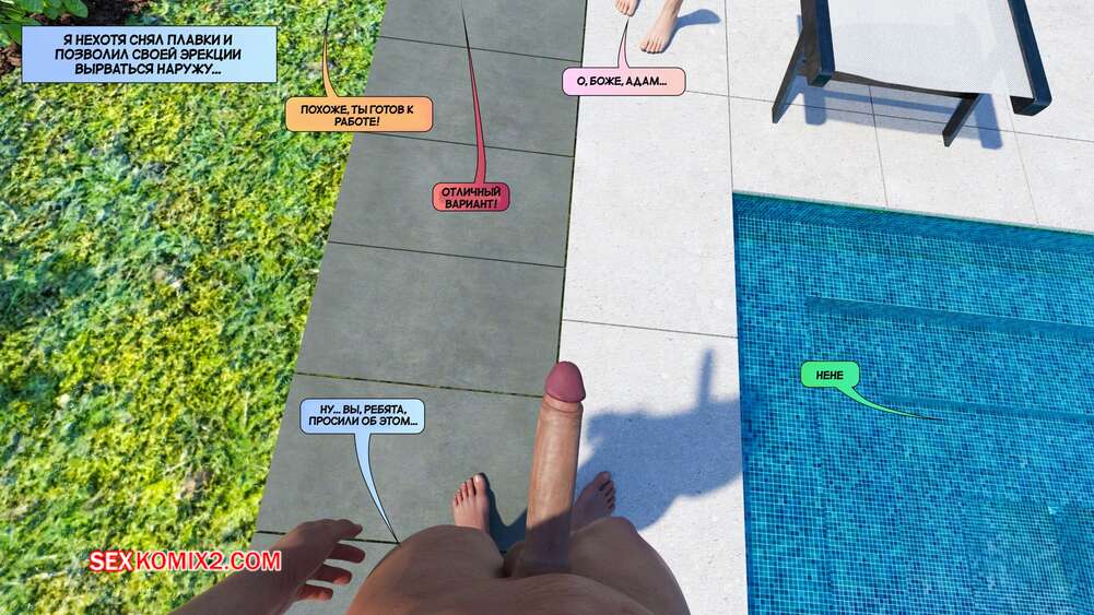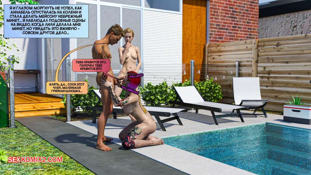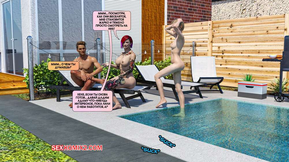 Порно комикс Новые соседи. Часть 16. The New Neighbors. Antalore42 Адам и Лили загорали у бассейна со своими соседями. Аннабель предложила всем раздеться, после чего уговорила Лили трахнуться с мужем, а сама стала скакать на члене Мейсона.