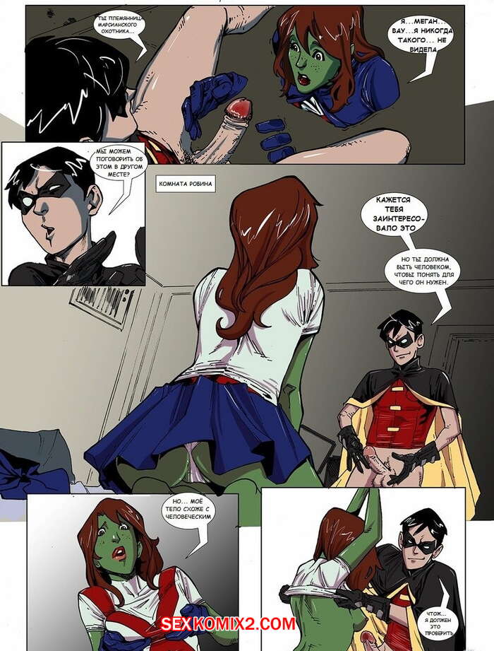 Порно комикс Юные Титаны. Hentaiunited Марсианский Охотник привел свою племянницу на базу Лиги Справедливости, где она сразу отправилась искать юных героев и наткнулась на на Робина, который дрочил, подглядывая за голыми героинями. Она решила развлечься с Робином, и после тщательных оральных ласк, они поебались, хорошенько познакомившись.