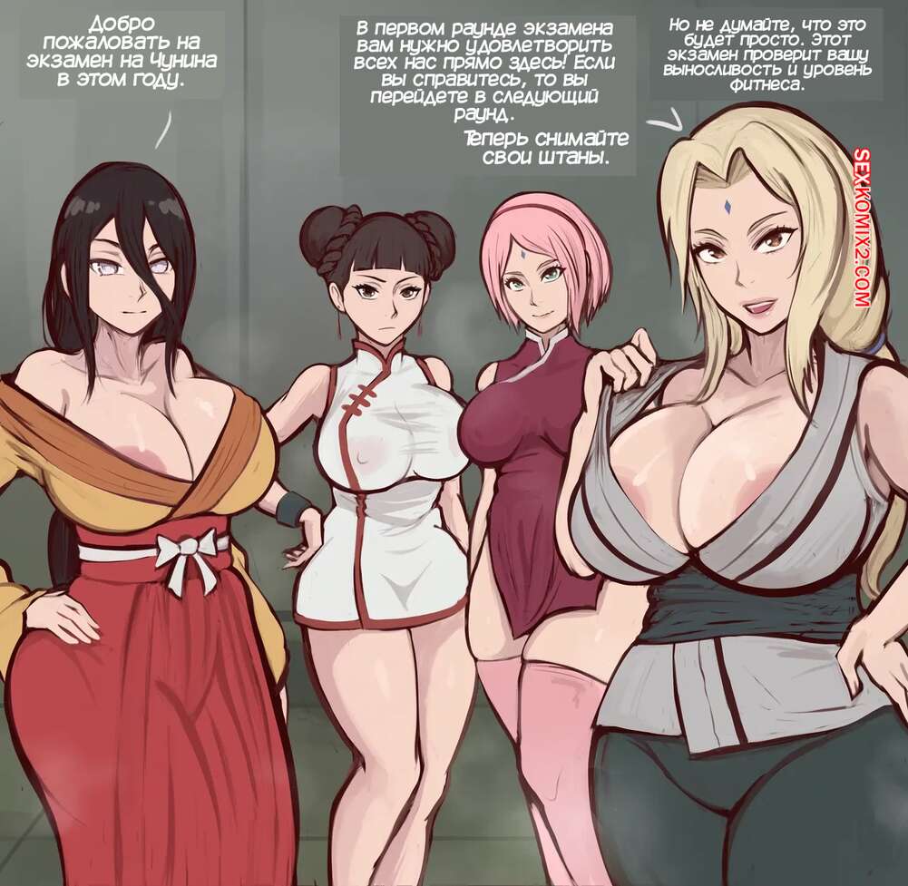 Порно комикс Наруто. Цунаде, Сакура, Тентен и Ханаби. Тест на Чунина. Arachnart Молодые парни проходят экзамен на Чунина и для этого им надо удовлетворить четырех красоток. Парни сразу взялись за дело и выебали сучек во все дырочки, доставив им огромное удовольствие.