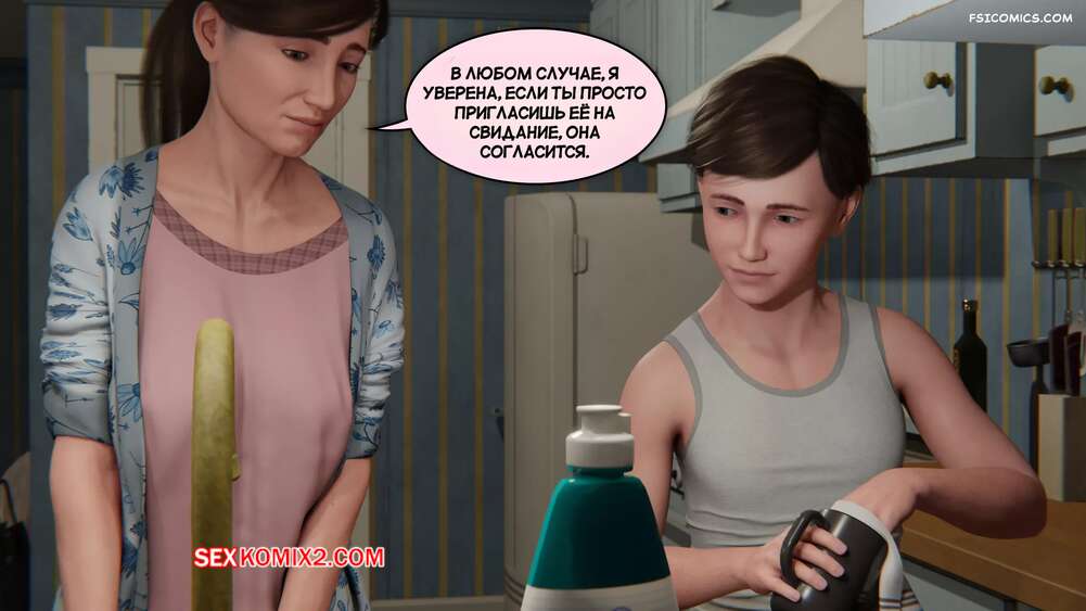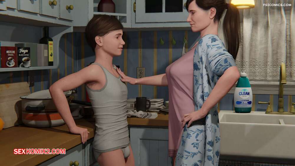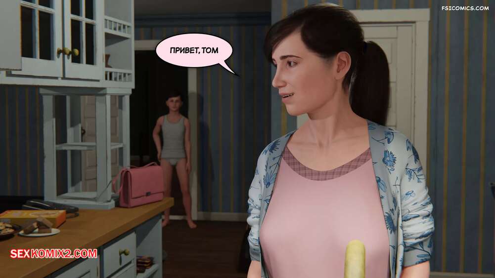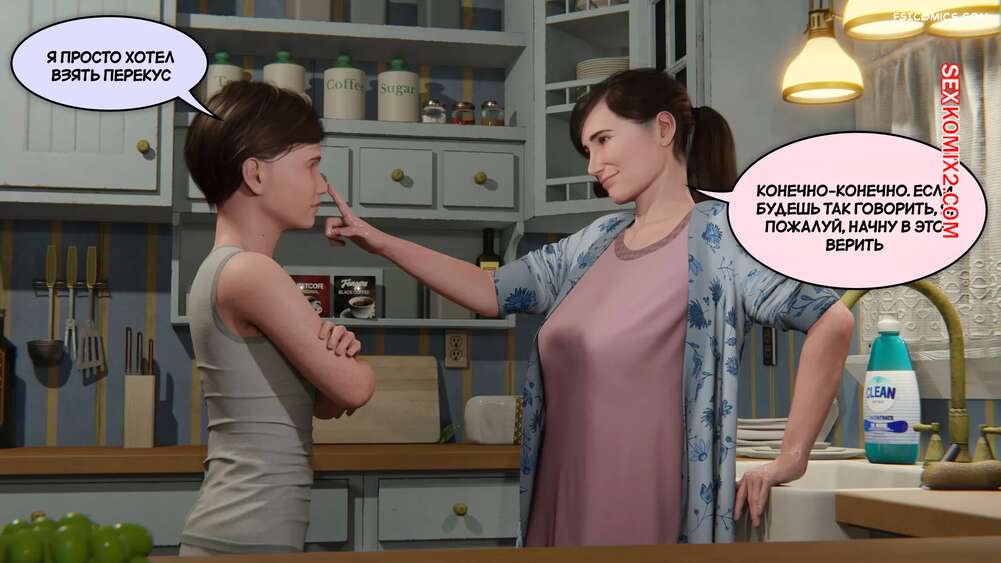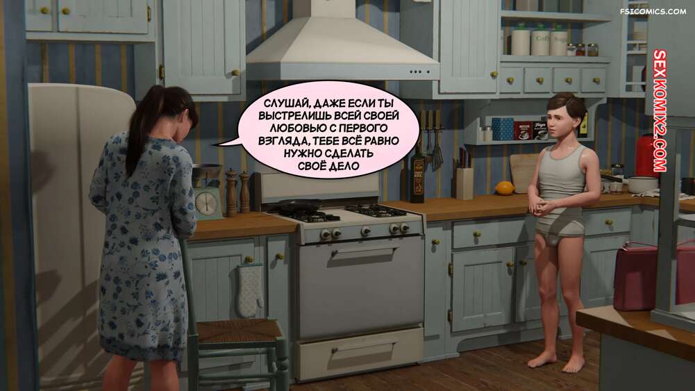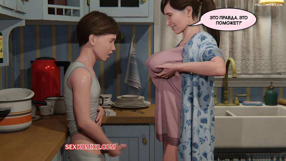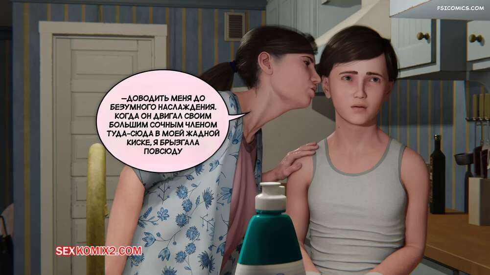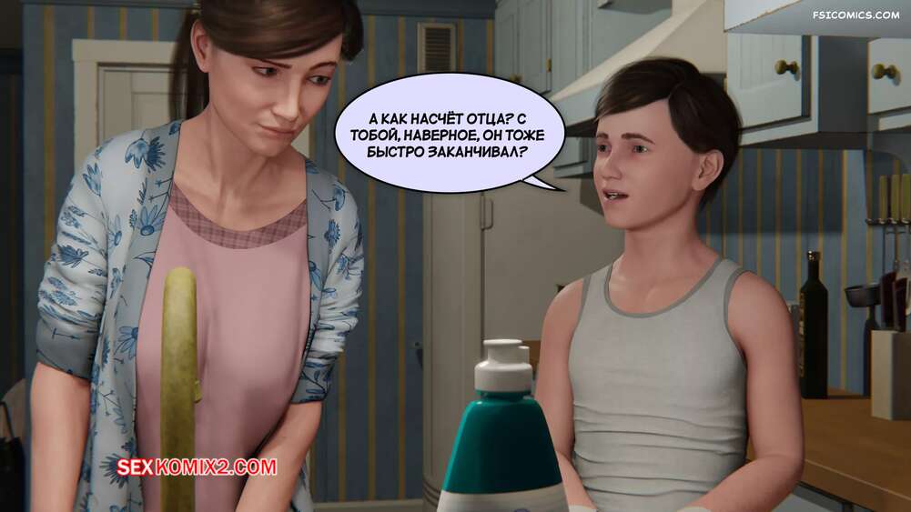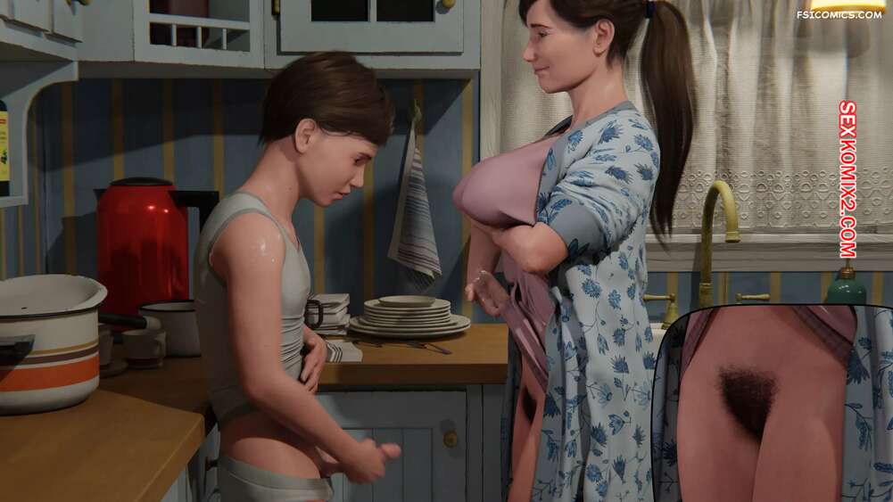 Порно комикс Истории Сантори. Часть 2. Santori Stories. Santo Fabbro Горячая милфа занималась готовкой на кухне и заметила подглядывающего сына. Она села на стул и дала ему полизать свою киску, посел чего сама встала на колени и отсосала член сыночка.