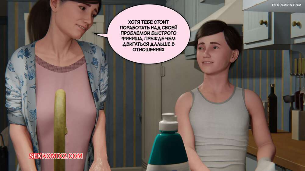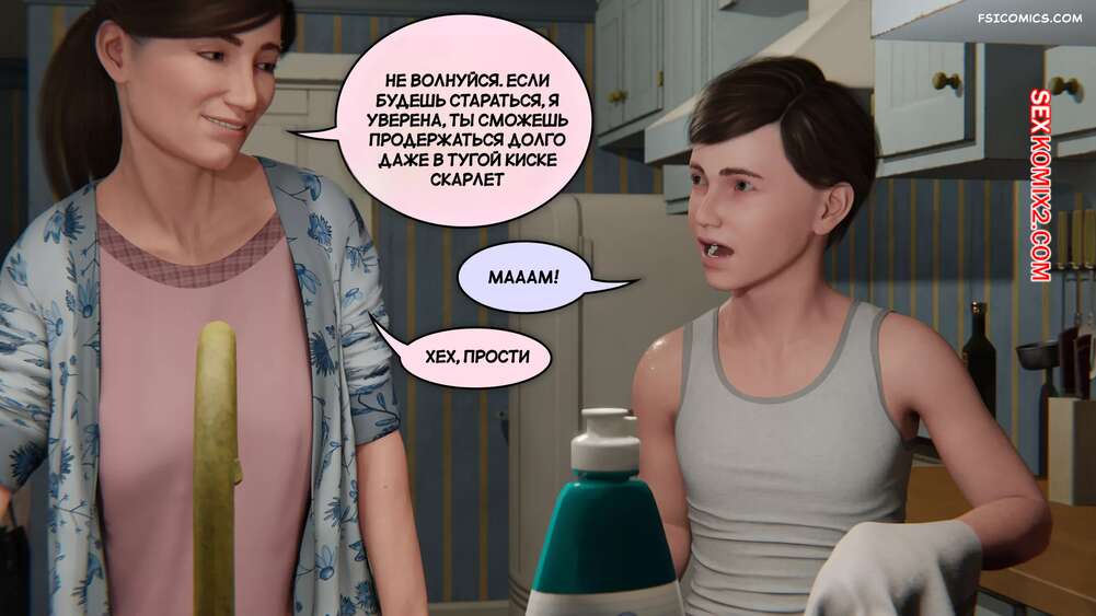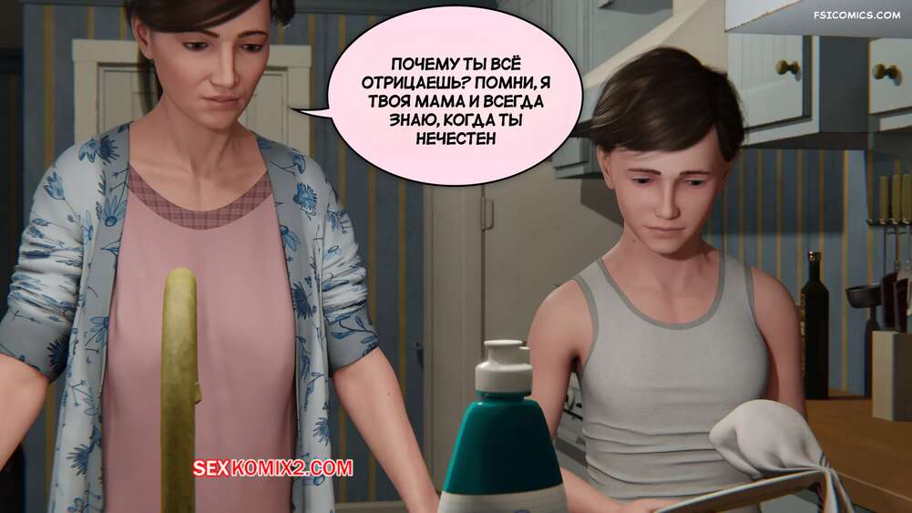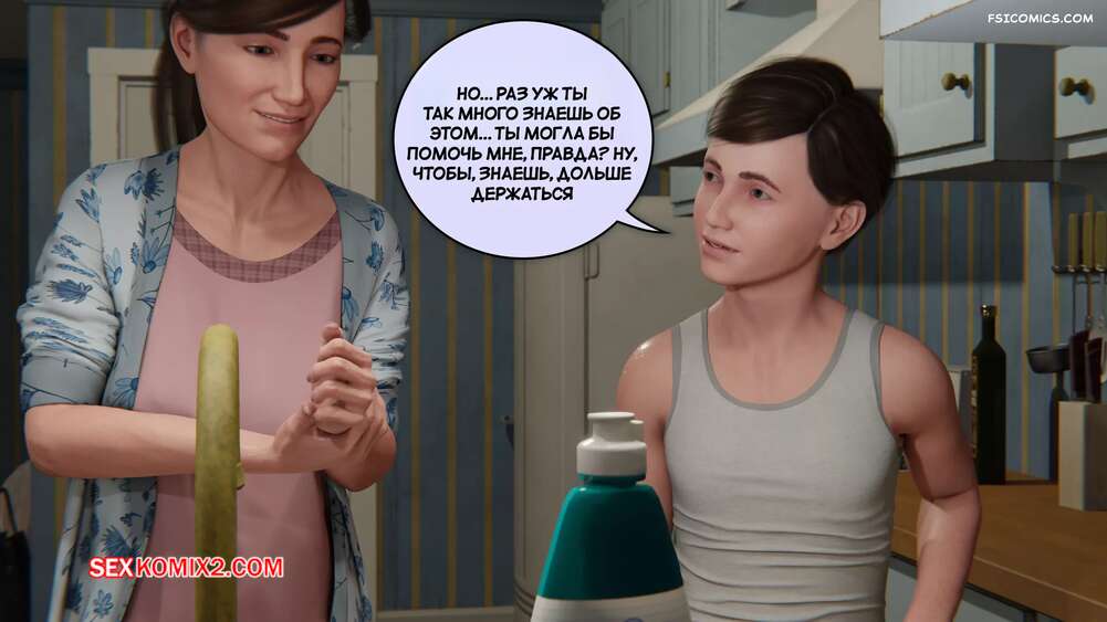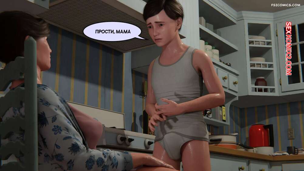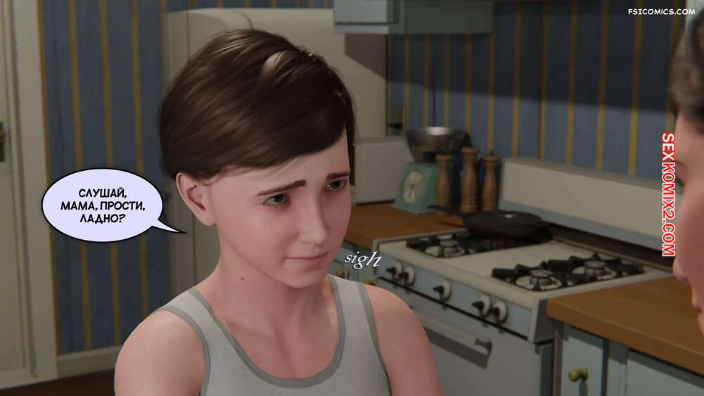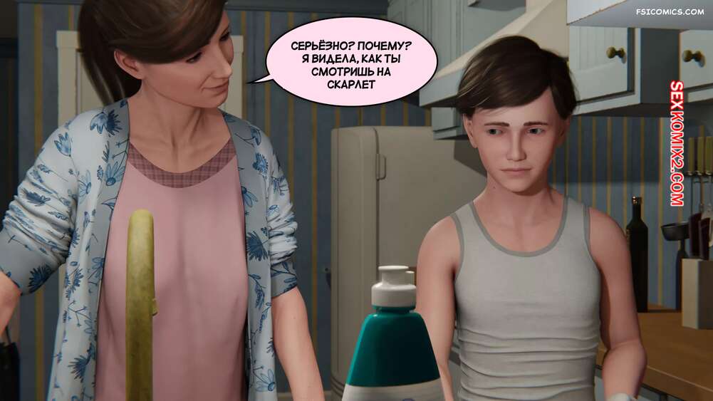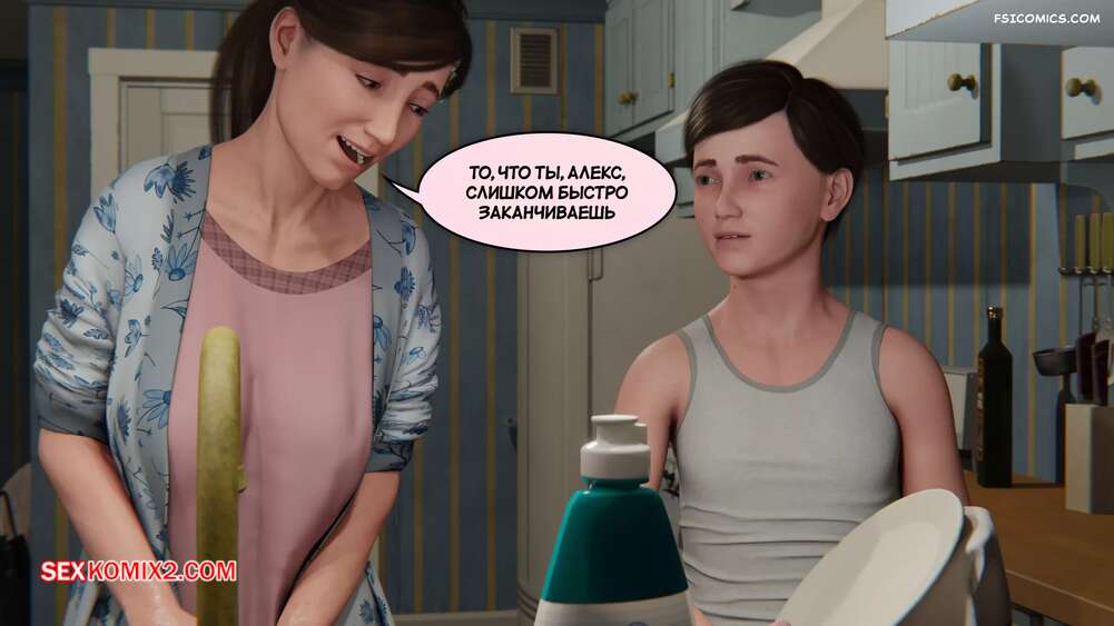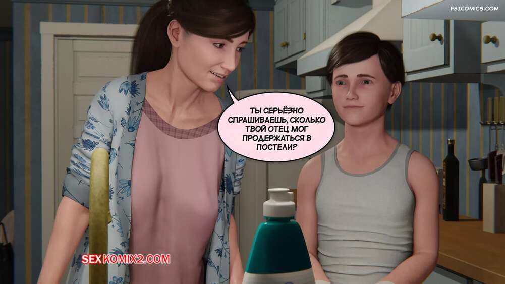 Порно комикс Истории Сантори. Часть 2. Santori Stories. Santo Fabbro Горячая милфа занималась готовкой на кухне и заметила подглядывающего сына. Она села на стул и дала ему полизать свою киску, посел чего сама встала на колени и отсосала член сыночка.