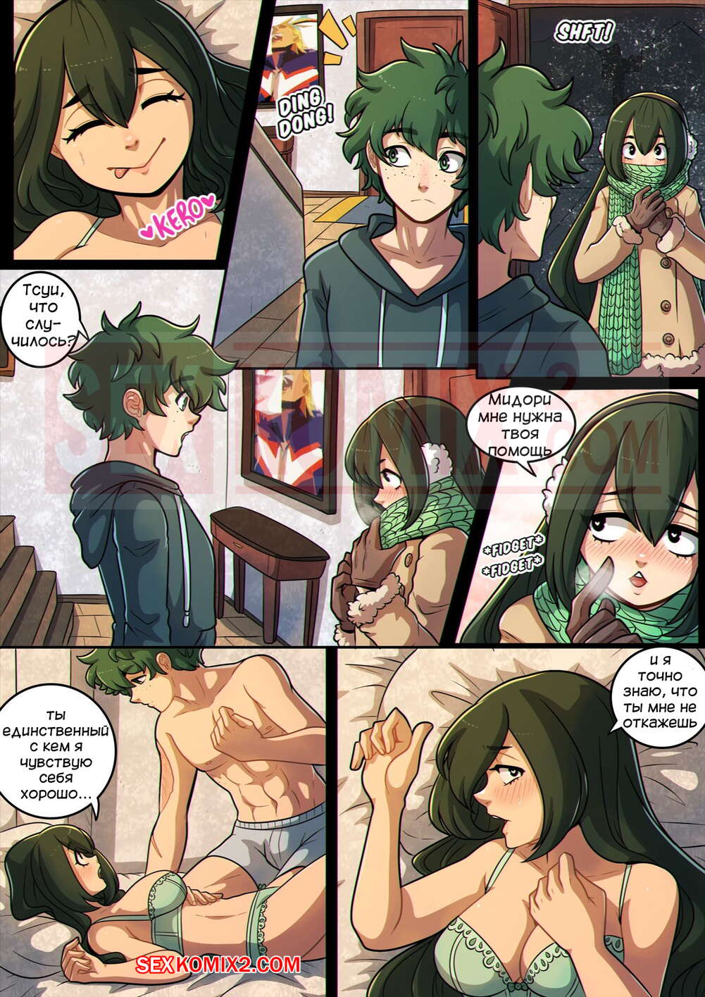 Порно комикс Геройская академия. Ночь с Тсуи. Kinkymation. Девушка лягушка пришла к своему другу, её нужно согреться, так как она хладнокровная. Парень с радостью вызвался помочь ей и занялся жарким сексом для согревания. Это и полезно и приятно.