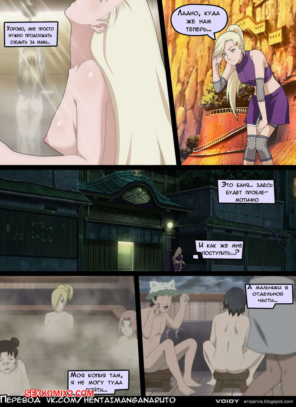 Порно комикс Наруто. Ино Яманака. Проблемы в мире Гендзюцу Красотка забрела по ошибке в мужскую баню, чем вызвала у парней невероятный интерес и возбуждение. Чтобы начать еще сильне их дразнить, красивая блондинка стала дрочить свой пизду дилдо, чтобы у парней слюнки потекли.