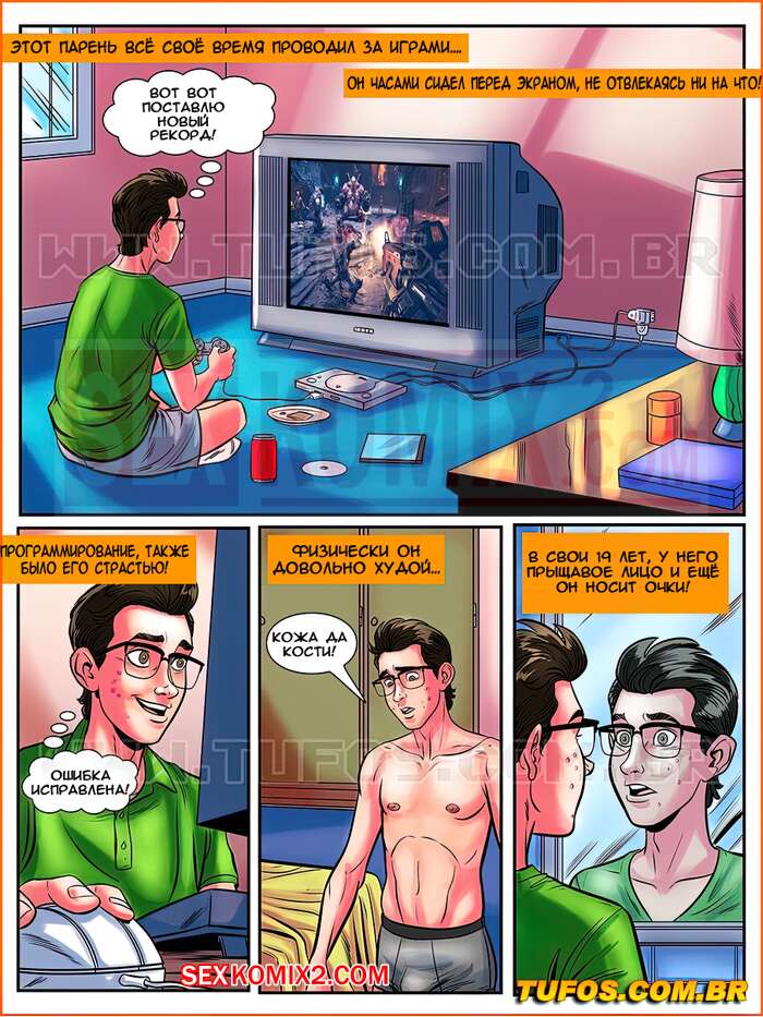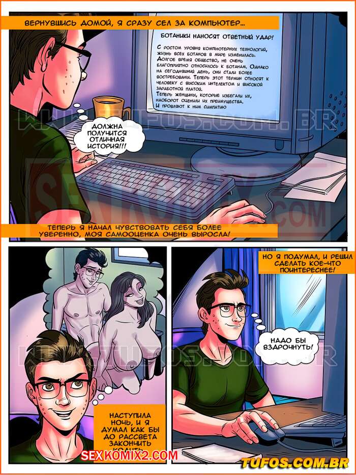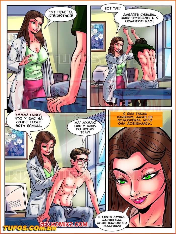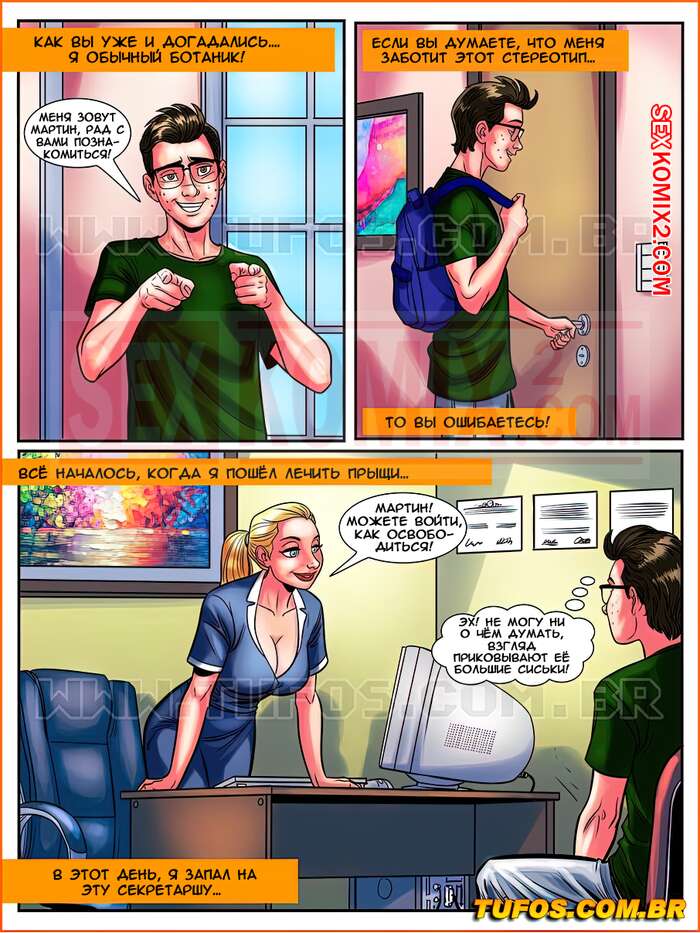 Порно комикс Знакомство заучки. Часть 1. Ботан с большой гордостью. Парень самый простой ботан, он даже не подозревает, что медсестра из его универа хочет его. Под предлогом медосмотра женщина позвала парня в свой кабинет, и попросила его раздеться. Она взяла его член в рот и начала сосать