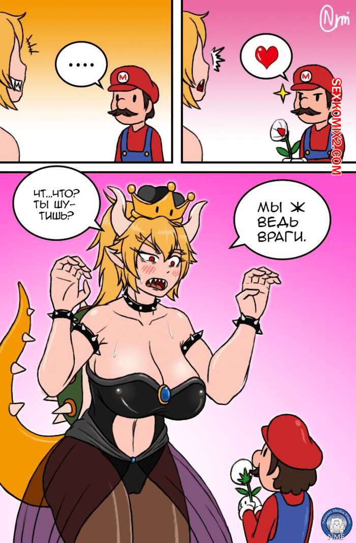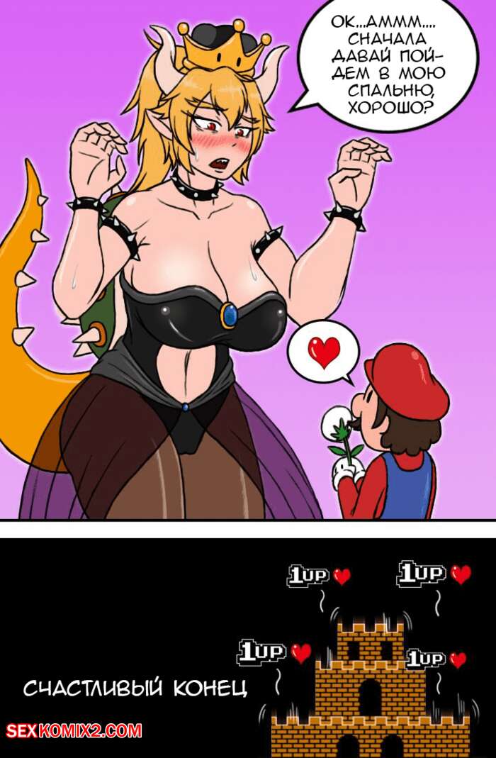 Порно комикс Марио и Боузета. Koopahime Manga Марио пришел спасать принцессу от своей заклятой соперницы, но принцессы там не было. Тогда парень решил подарить цветочек злодейке и это ее очень обрадовало. Она повела его к себе на кровать, где оседлала его хуй и стала трахать, а он становился просто огромных размеров внутри нее.
