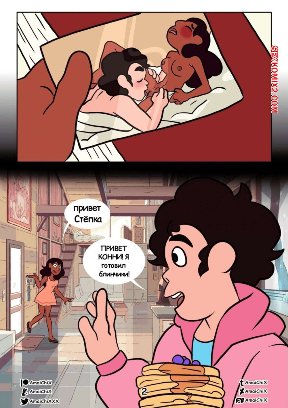 Порно комикс Вселенная Стивена. Стивен и Кони. Hot Pancakes Когда девушка вернулась со школы, дома ее ждал дружок с блинчиками. Она оценила его уровень готовки, но также заметила, что парнишка обляпался в сиропе на своих яйцах. Девушка быстренько решилась помочь ему и стала там все вылизывать, а затем стала сосать его член. Как итог, все это переросло в классный страстный секс друзей.
