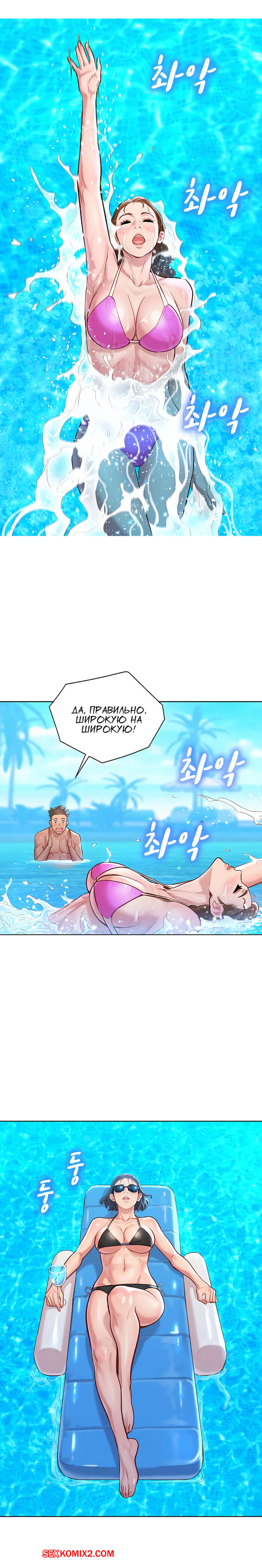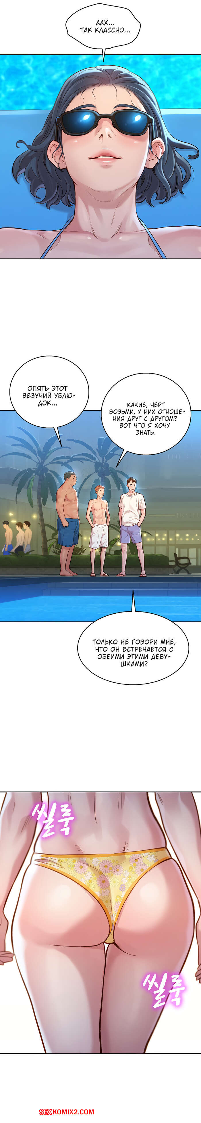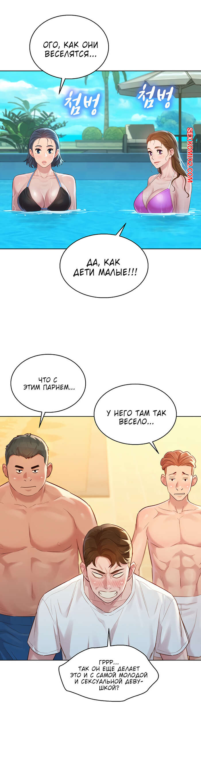 Порно комикс Сестра по соседству. Часть 127. Sister Neighbors. Отдых наших героев продолжается. Парень отлично проводит время с тремя девушками, они веселятся и купаются в бассейне. Но трое парней по соседству, очень хотят этих красоток. Они считают не справедливым распределение девушек.