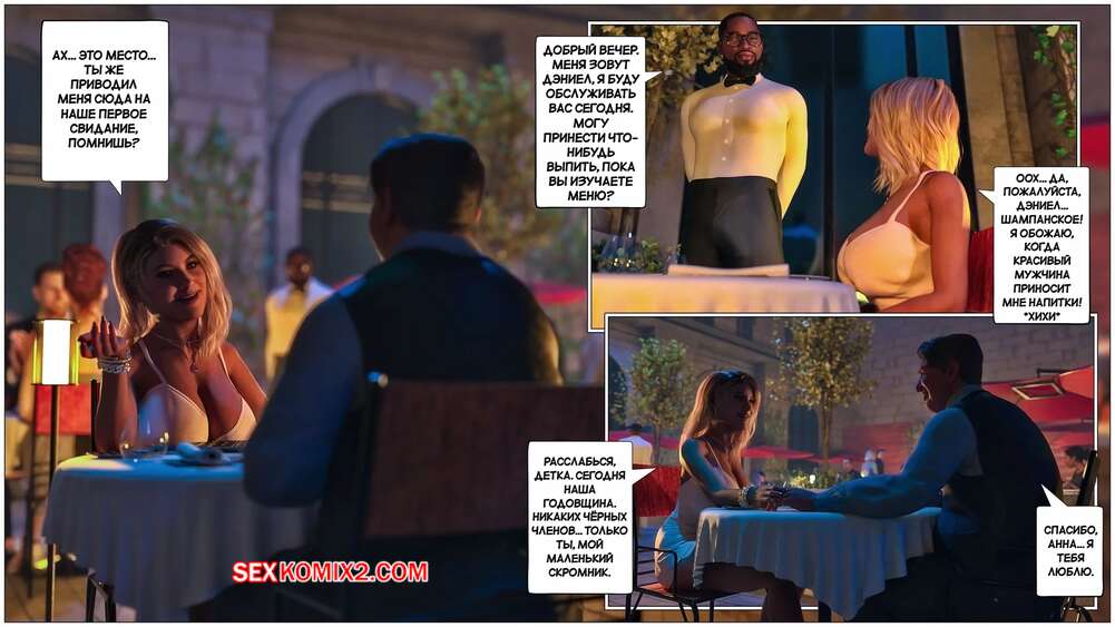 Порно комикс Черная метка. Часть 4. Black Marked. Tab109 Мужик привел свою жену шлюху в ресторан и сделал ей подарок в виде анальной пробки. Они отправились в туалет, где красотка раздвинула ножки и приняла в попку подарок, после чего пошла красоваться перед темнокожим официантом.