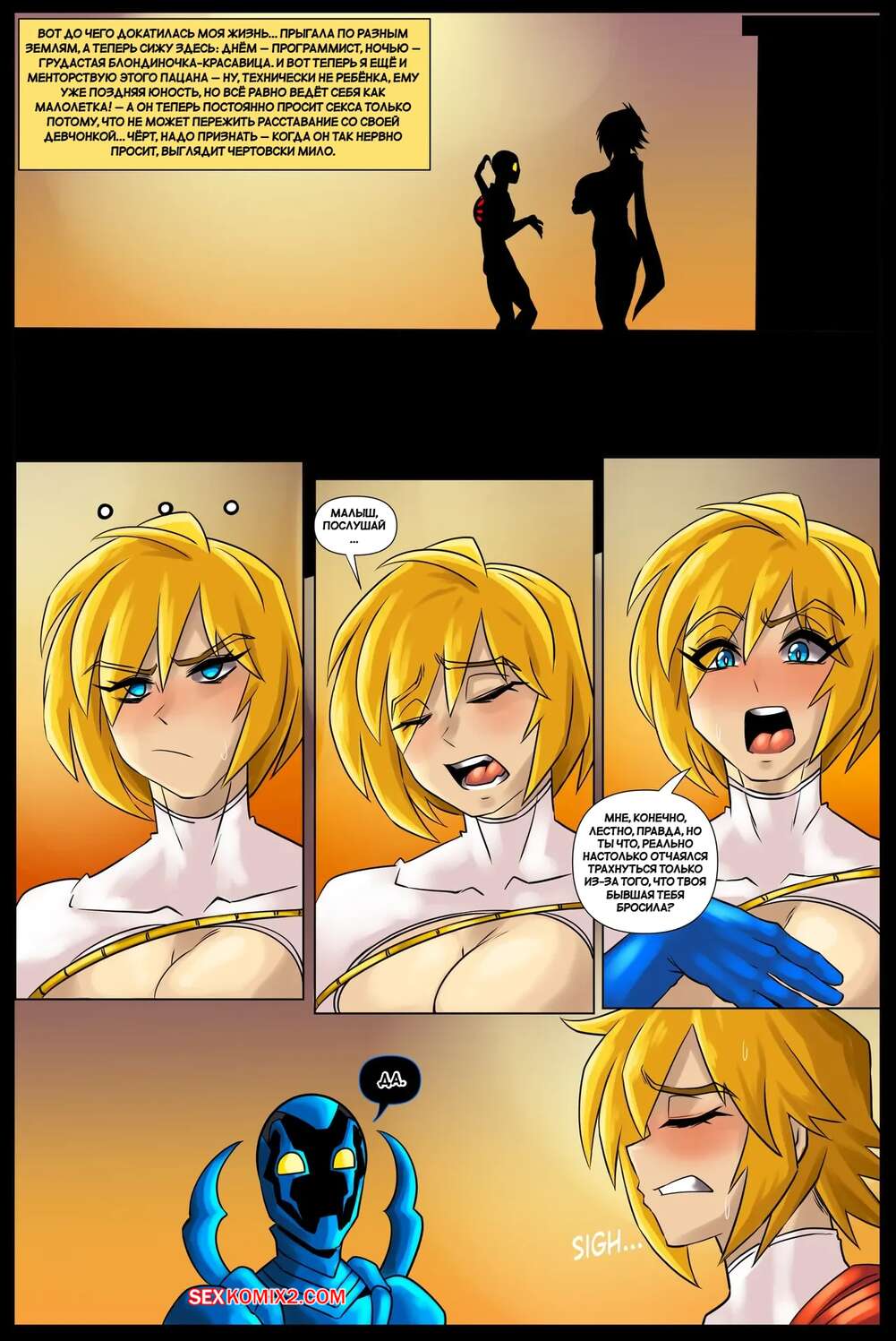 Порно комикс DC. Пауэр Герл. В полной боевой готовности. Power Girl All Powered Up. RyoSuArt. Красотка Пауэр Герл возбуждена и хочет секса. Она позирует перед Синим Жуком и соблазняет парня своим аппетитным телом, после чего раздвигает ножки и дает выебать свою пизду, заполняя ее спермой.