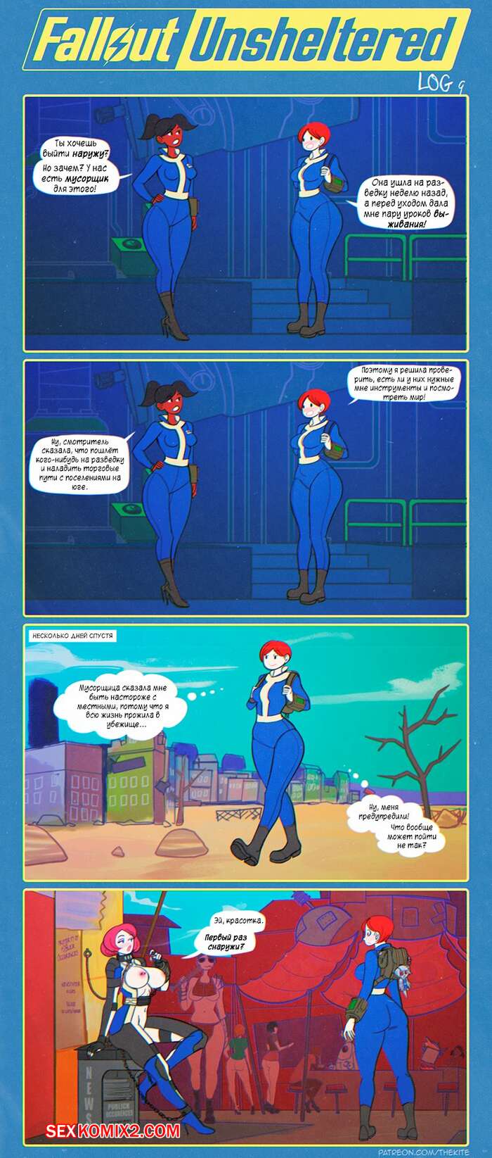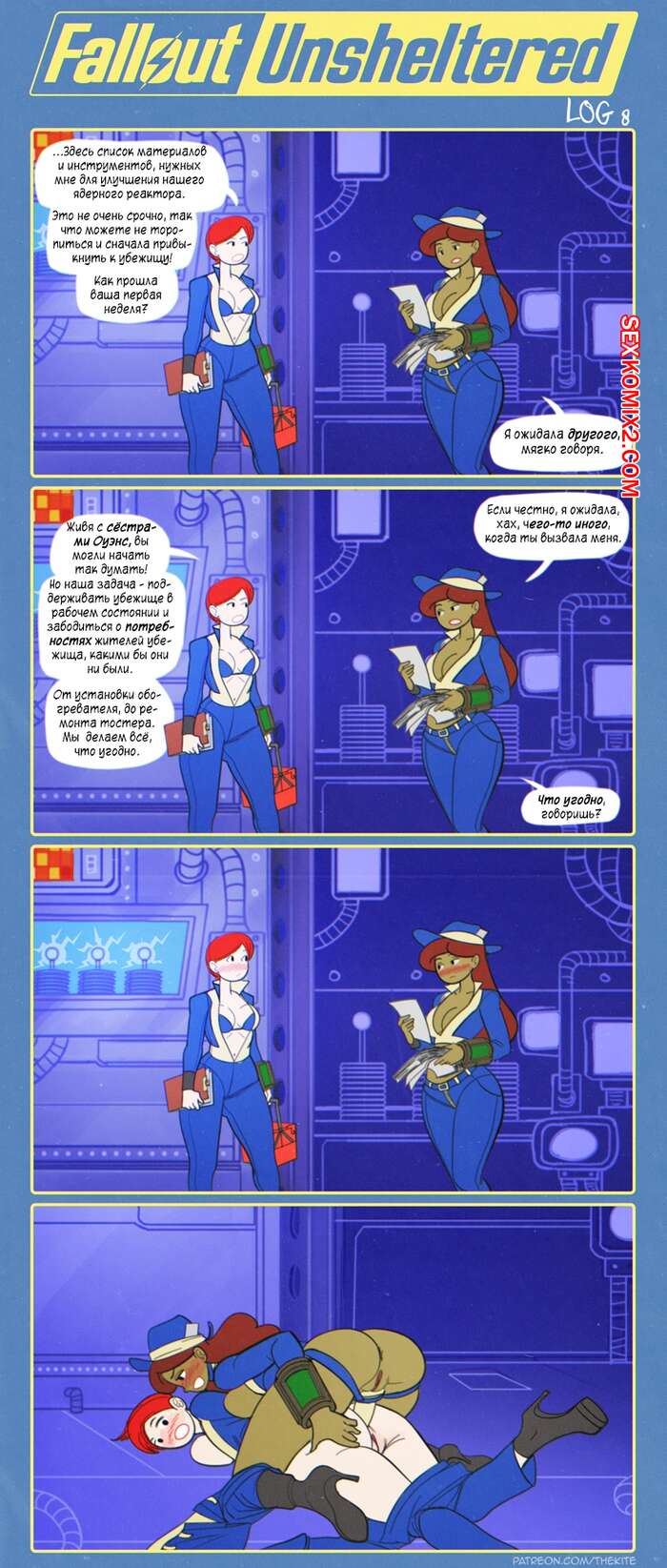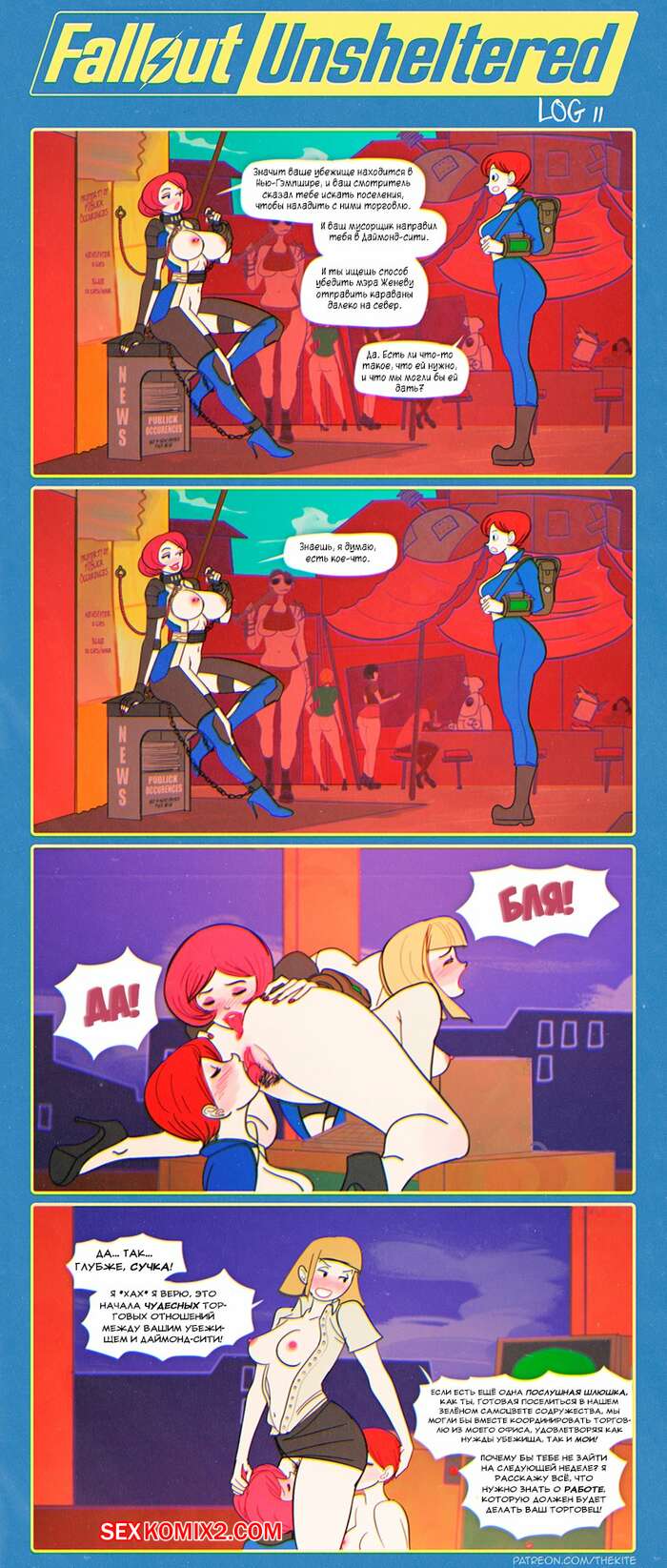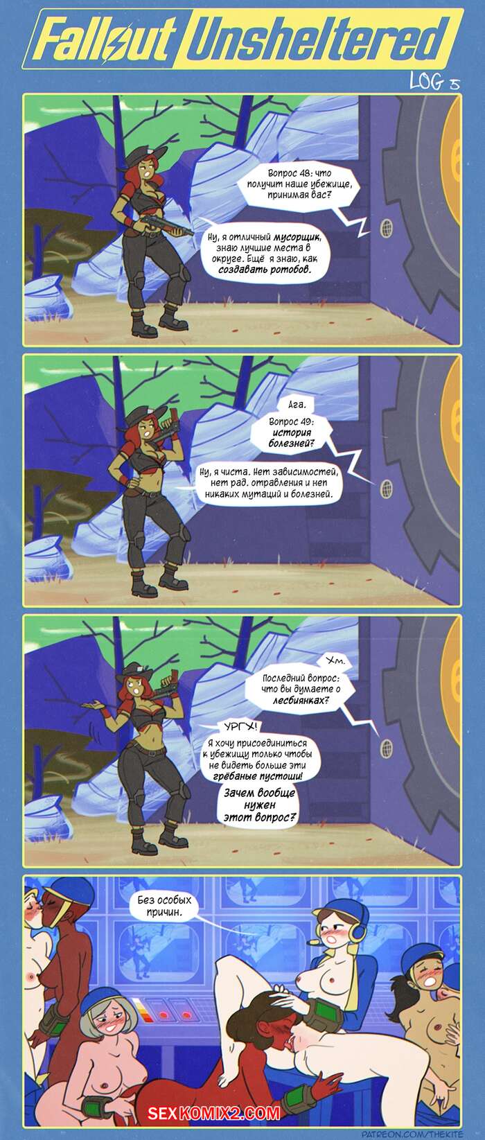 Порно комикс Фоллаут Без укрытия. Fallout Unsheltered. The Kite Красоткам стало скучно проводить время у себя в бункере, поэтому они решили развлекать друг дружку, устраивая лесбийские игры. Благо у когото из них был хуй, поэтому они могли трахаться намного веселее и приятнее, чем простой лесбийский секс.