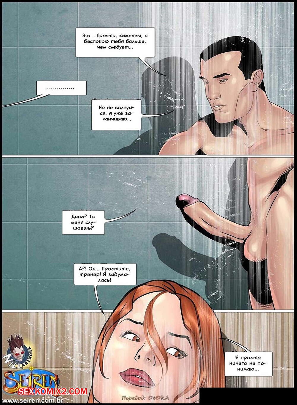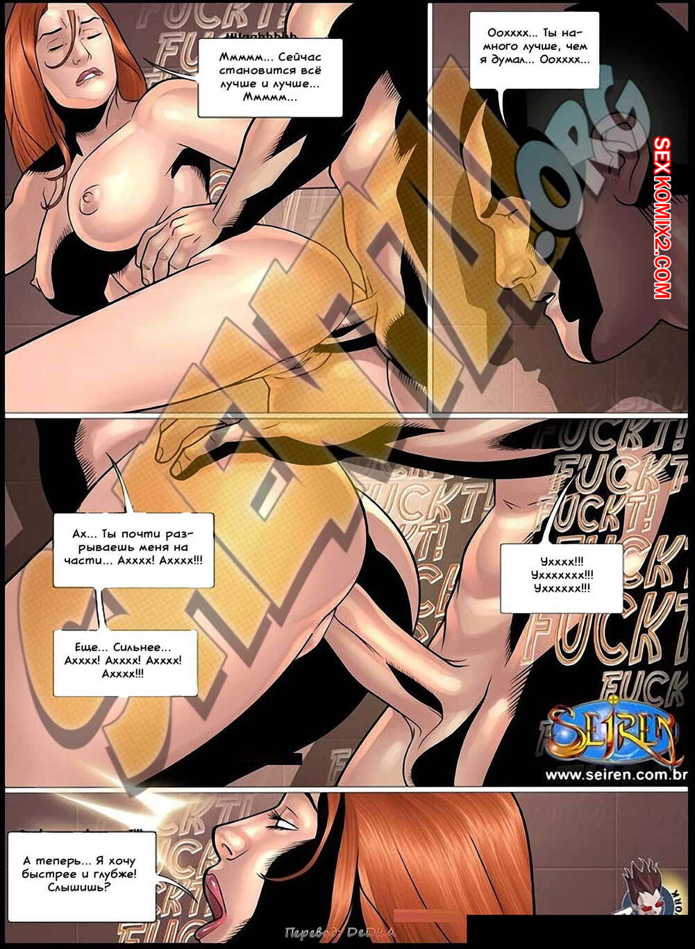 Порно комикс Спортсменка. Часть 4. Эпизоды 1 и 2 и 3 и 4 Рыжей красотке настолько понравился парнишка из спортзала, что она решила позвать его к себе домой, пока ее муженек был на работе и изменял ей со своей коллегой. Рыжая сучка разделась перед молодым пареньком, отсосала ему, а затем позволила себя выебать.