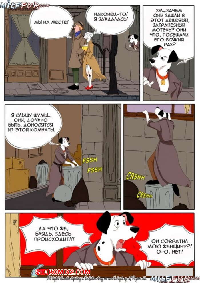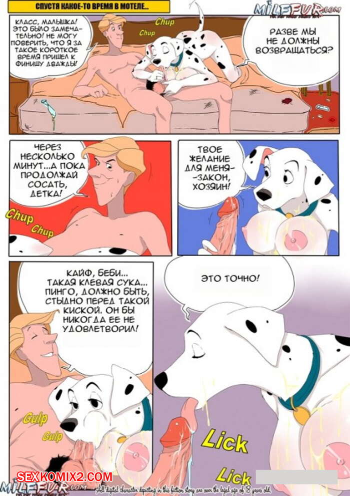 Порно комикс Фурри. 101 долматинец Два мужика вора влезли в дом к мужику и спалили, как он трахает свою подругу далматинку. Они связали мужика на стуле, а сами заняли его место и с удовольствием оттрахали во все дырки далматинку.