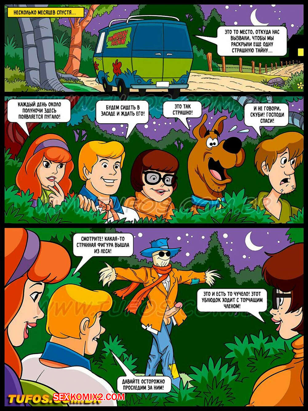 Порно комикс Скуби Ду. Часть 5. Развратное Пугало Команда СкубДу отправилась на новое задание, где они наблюдали за наряженным пугалом, ебущим шикарную молодую блондинку. Команда так сильно возбудилась, что решила сама заняться еблей прямо там.