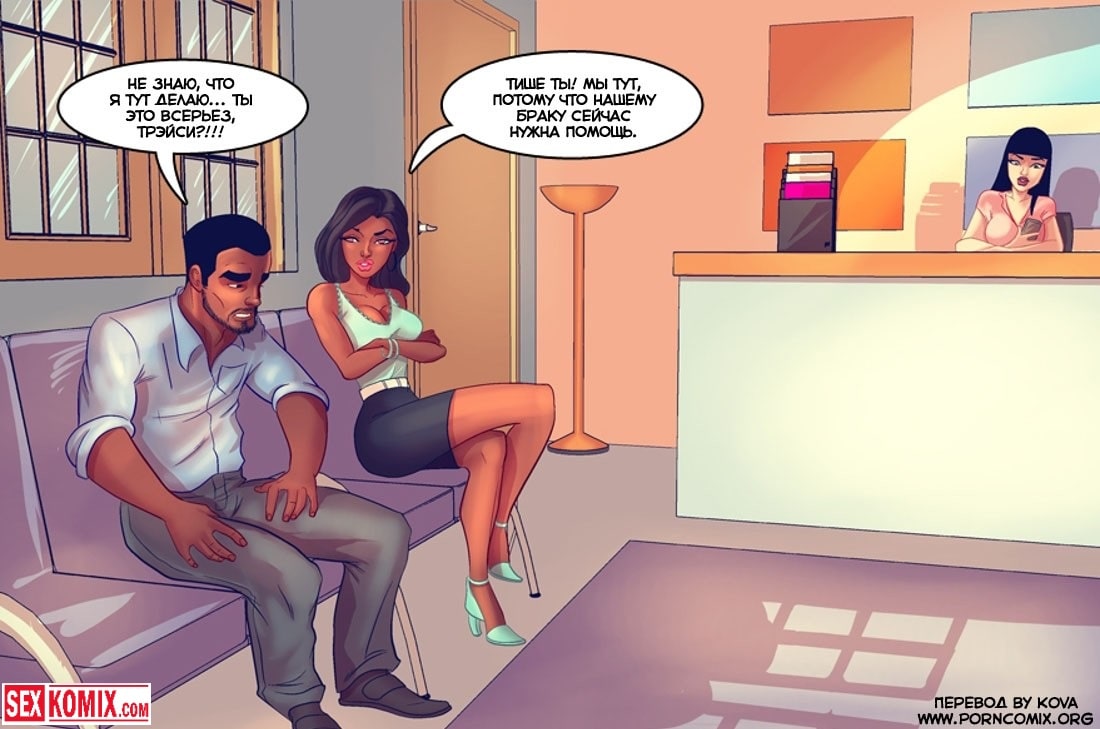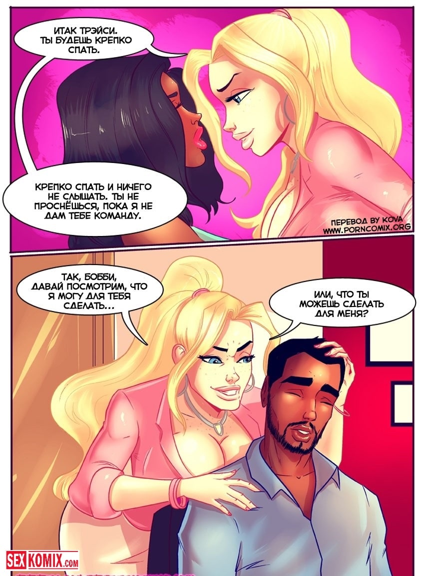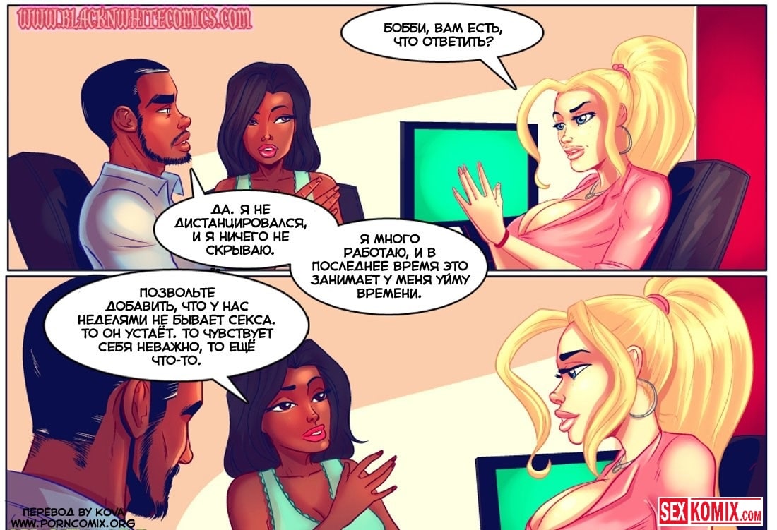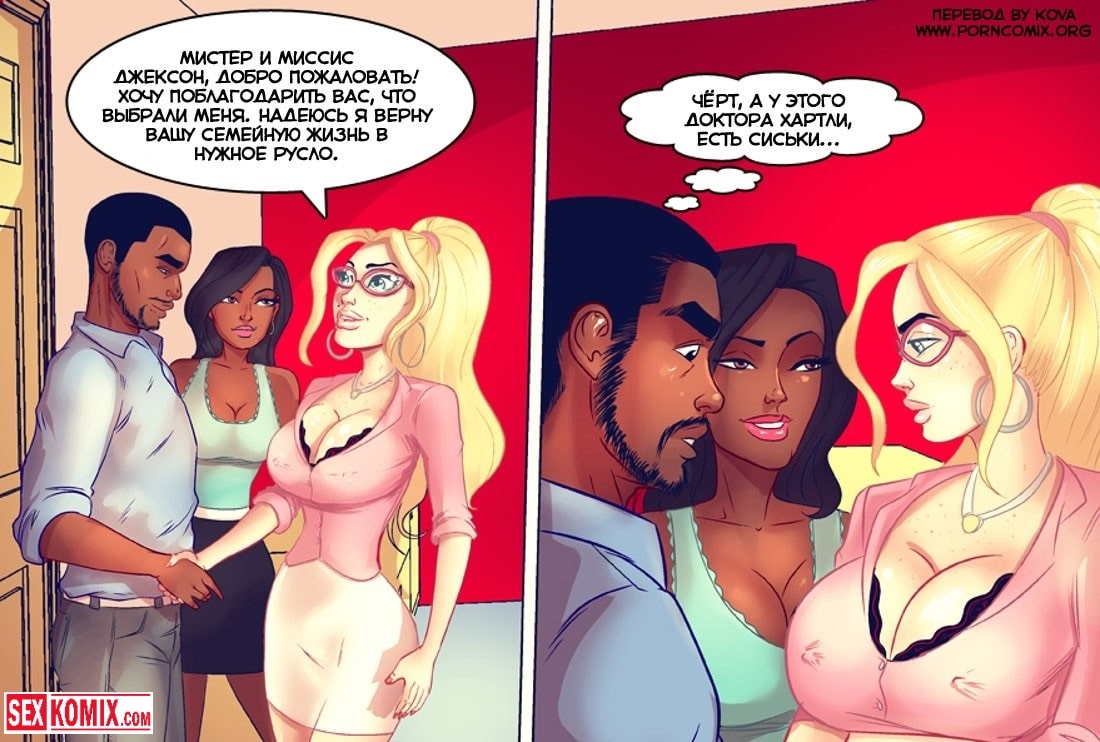 Порно комикс Семейный психолог. Чернокожий парень и девушка уже давно в супружеском браке и у них начали психологические проблемы. Для того, чтобы решить данную проблему они обратились к профессиональному психологу, которым была сексуальная блондинка. Когда сеанс начался блондинка ввела в гипноз обоих, разбудила парня, но жену оставила спать. Она показала ему, что его жена в отключке и ничего не запомнит. И предложила её хорошо трахнуть, неверный муж с удовольствием согласился на это предложение, и засунул свой толстый член в горячую белую киску.