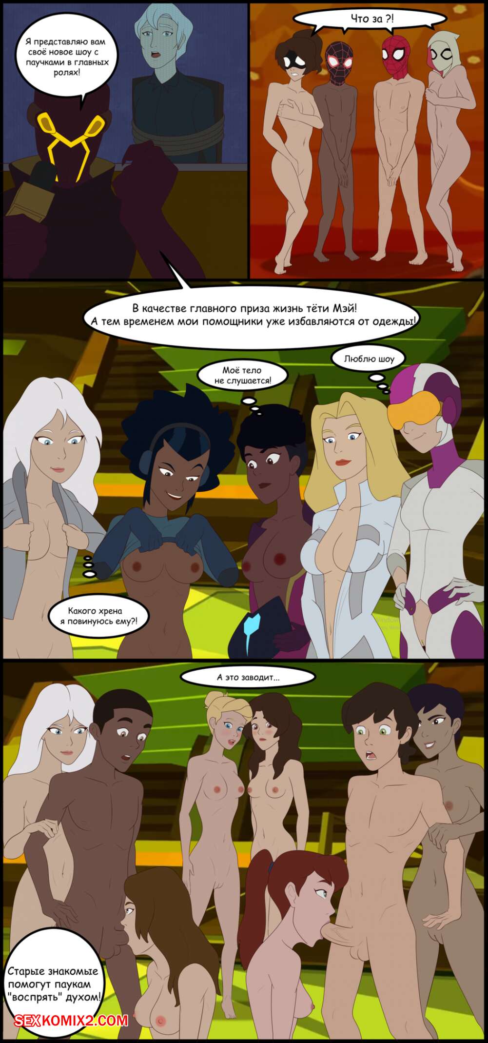 Порно комикс Человек Паук и Шоу РОЯ ЧеловекиПауки из разных вселенных оказались вместе абсолютно голые. Сперва они не понимали, что произошло, но затем решили воспользоваться этим и устроили горячую оргию.