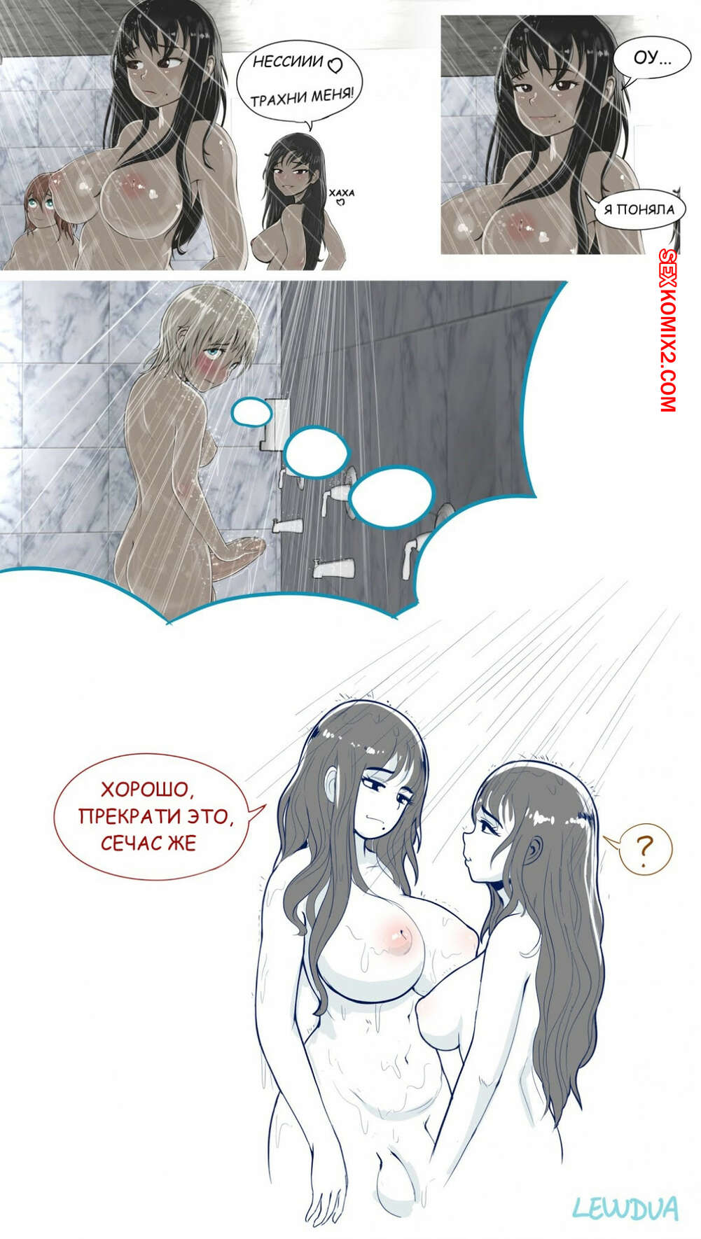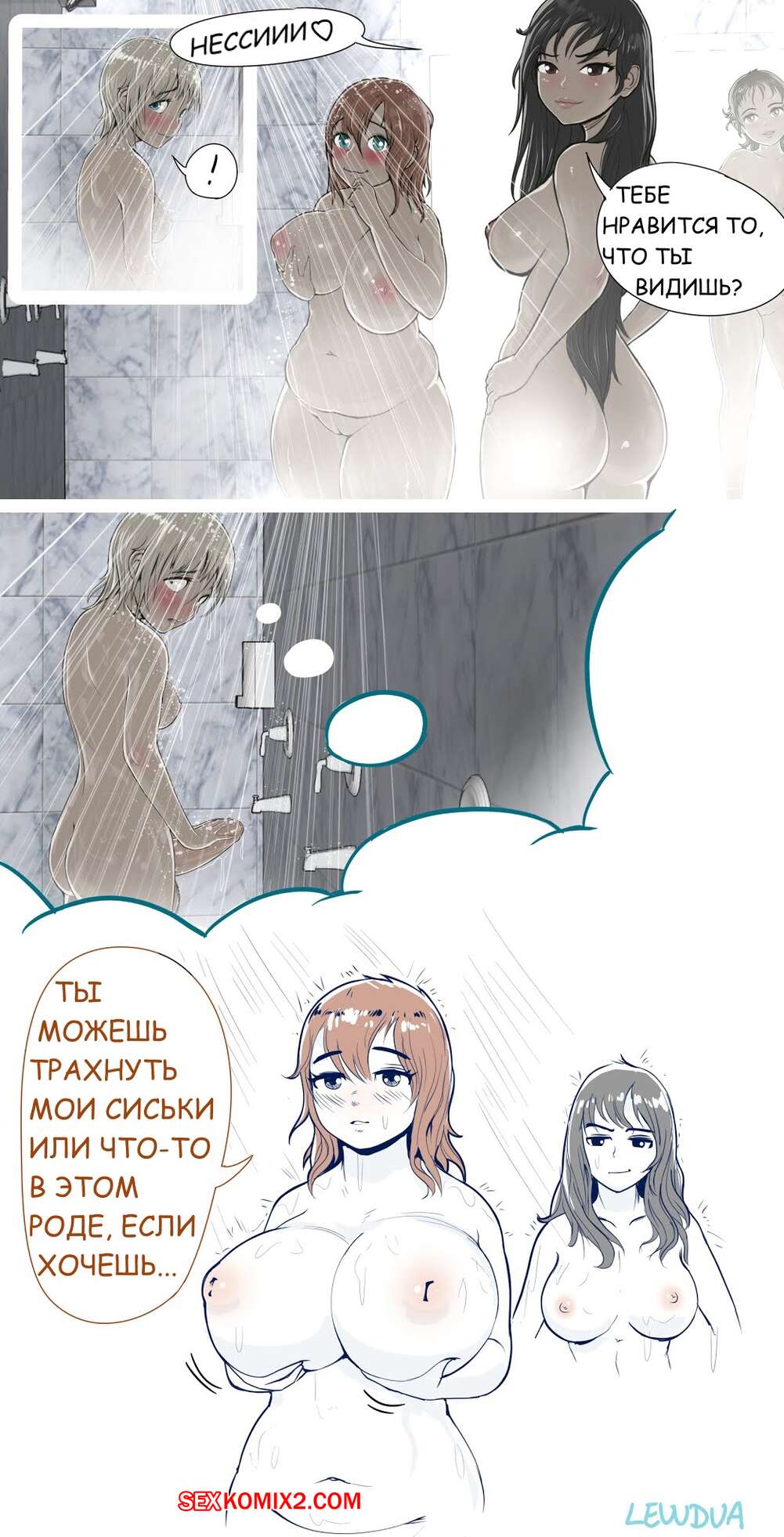 Порно комикс Несси и Алисон в душевой Две горячих красотки решили повеселиться в душе. К счастью у блондиночки при себе имеется большой хуй, так что она дала его отсосать своей подруге, а затем хорошенько выебала.