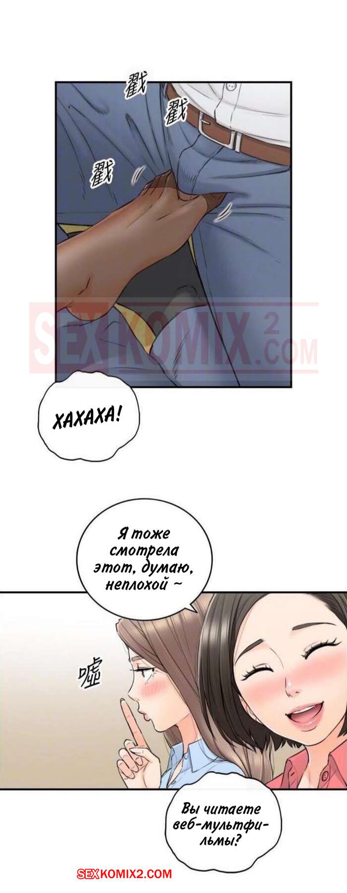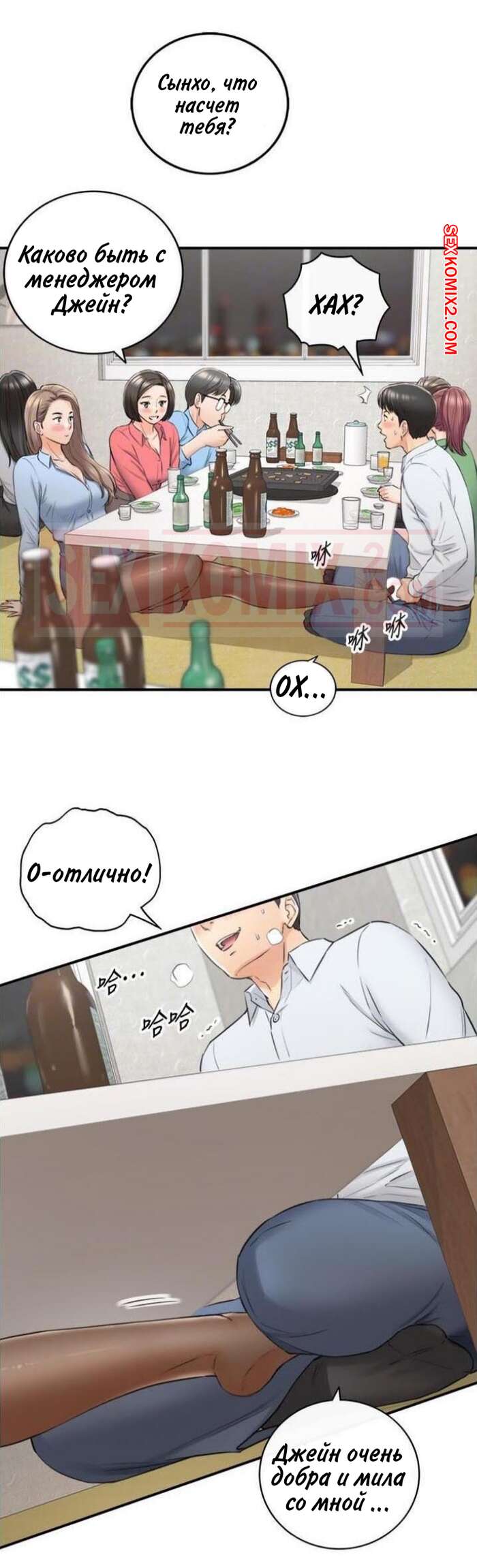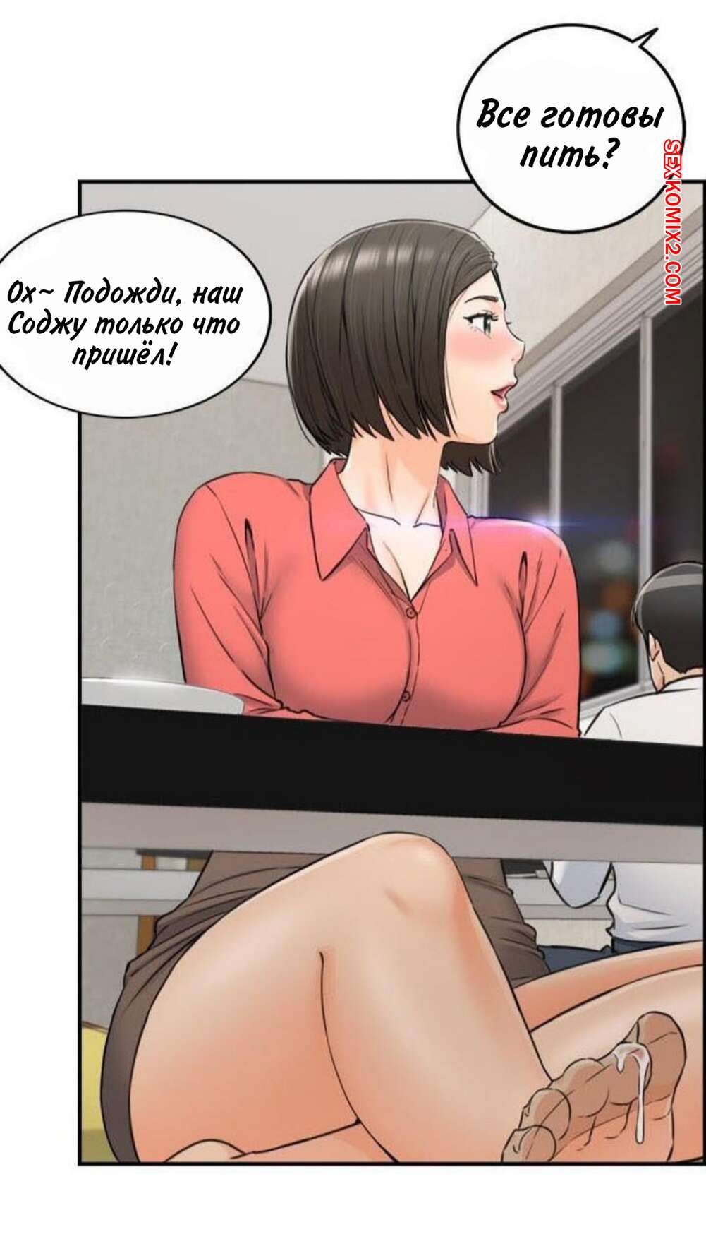 Порно комикс Молодой босс. Часть 92. Young boss Горячая красотка брюнетка продолжила ласкать член парня своей ножкой, но они чуть не спалились, ведь парня попросили встать и сказать речь. К счастью, им удалось отмазаться и затем парня стала ласкать ногой еще одна девушка.