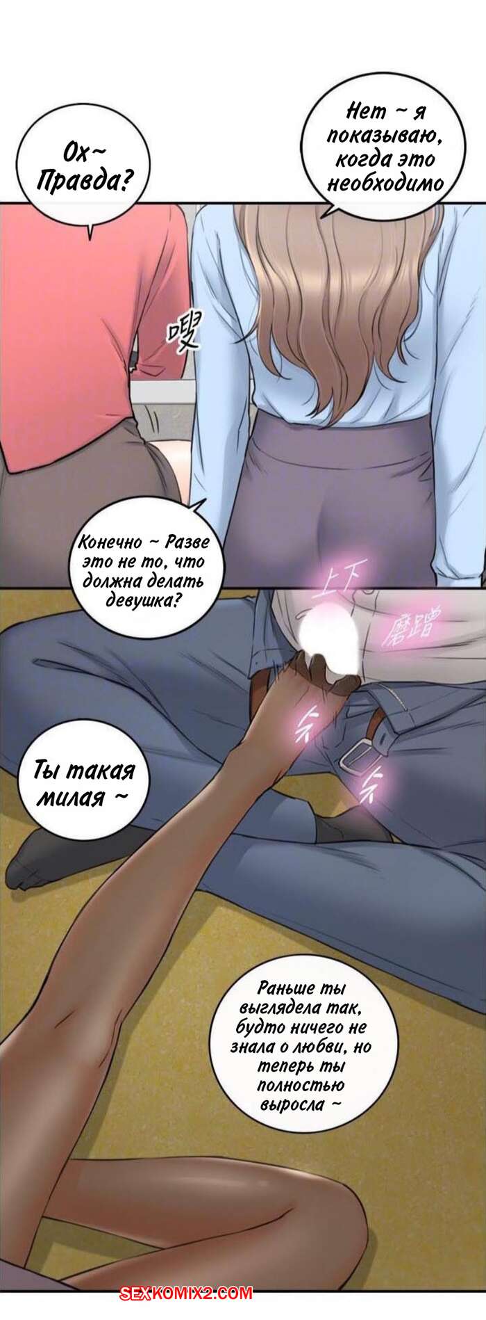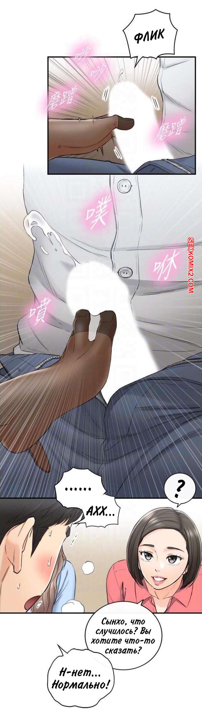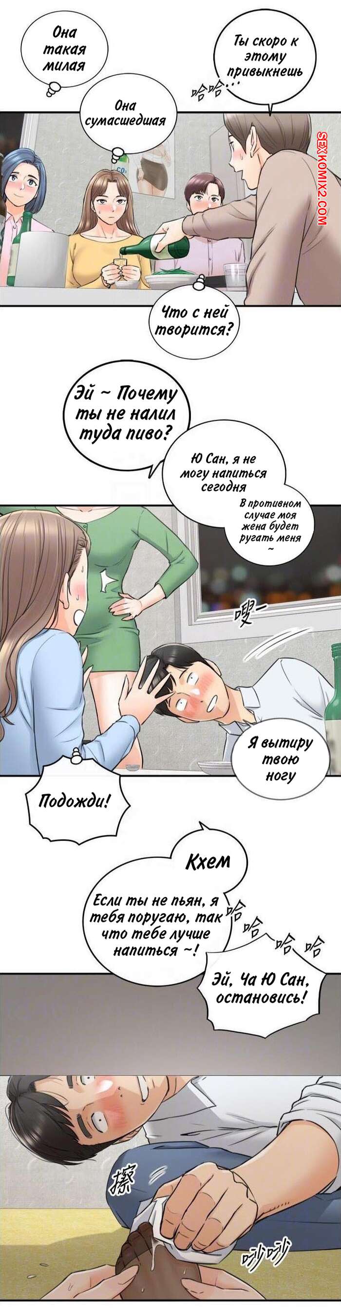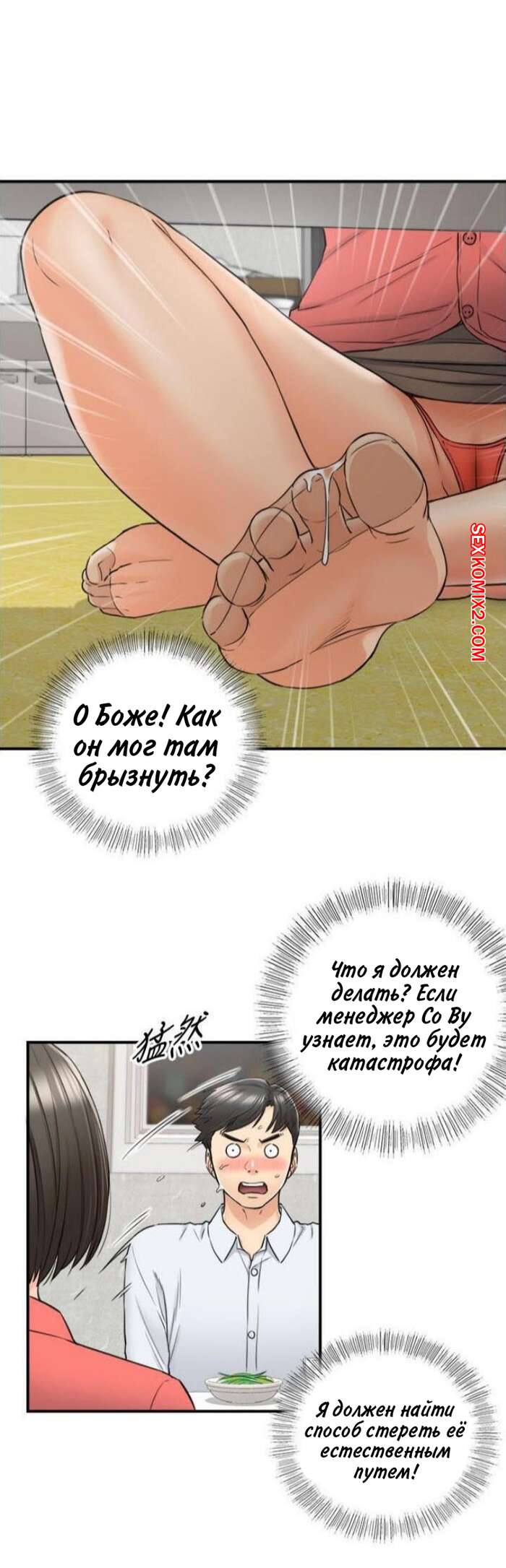 Порно комикс Молодой босс. Часть 92. Young boss Горячая красотка брюнетка продолжила ласкать член парня своей ножкой, но они чуть не спалились, ведь парня попросили встать и сказать речь. К счастью, им удалось отмазаться и затем парня стала ласкать ногой еще одна девушка.