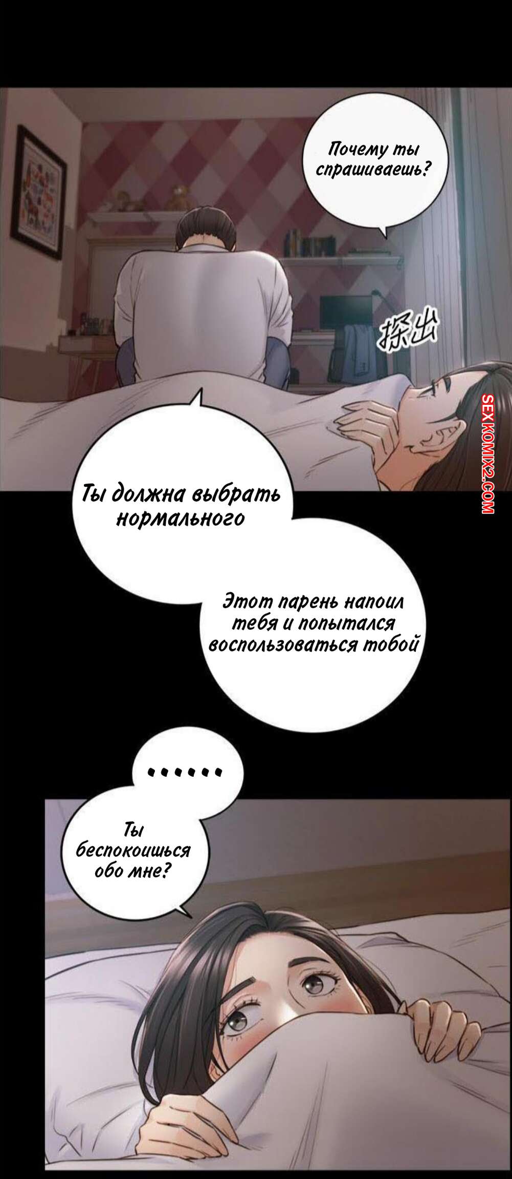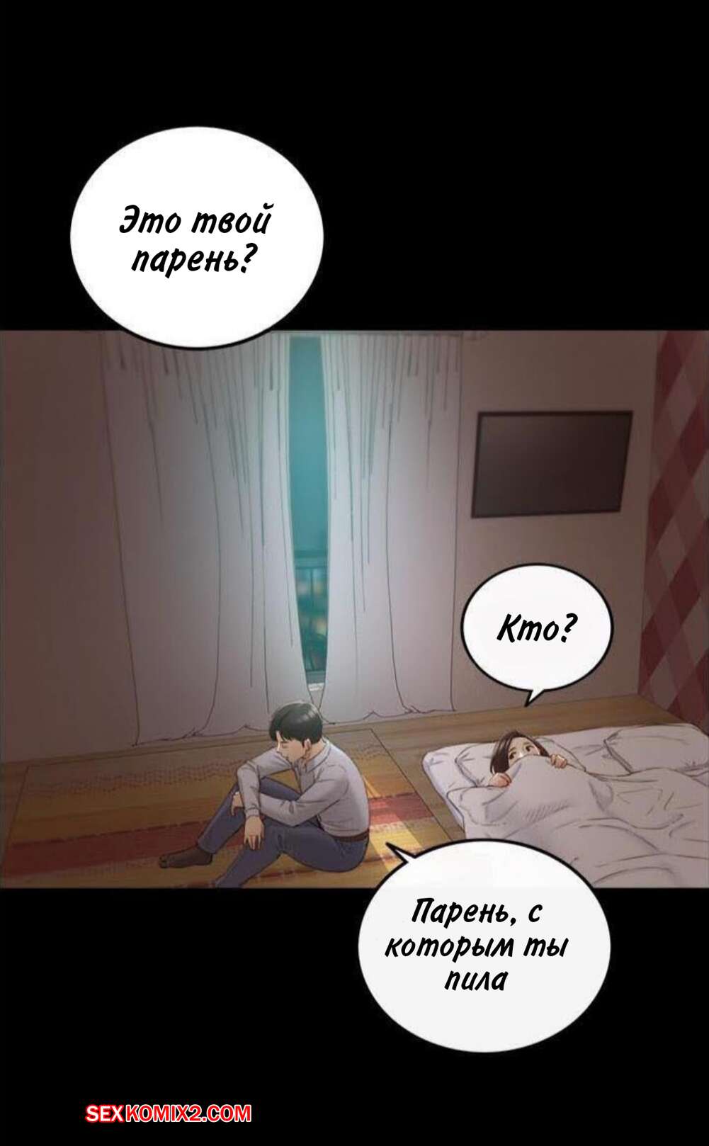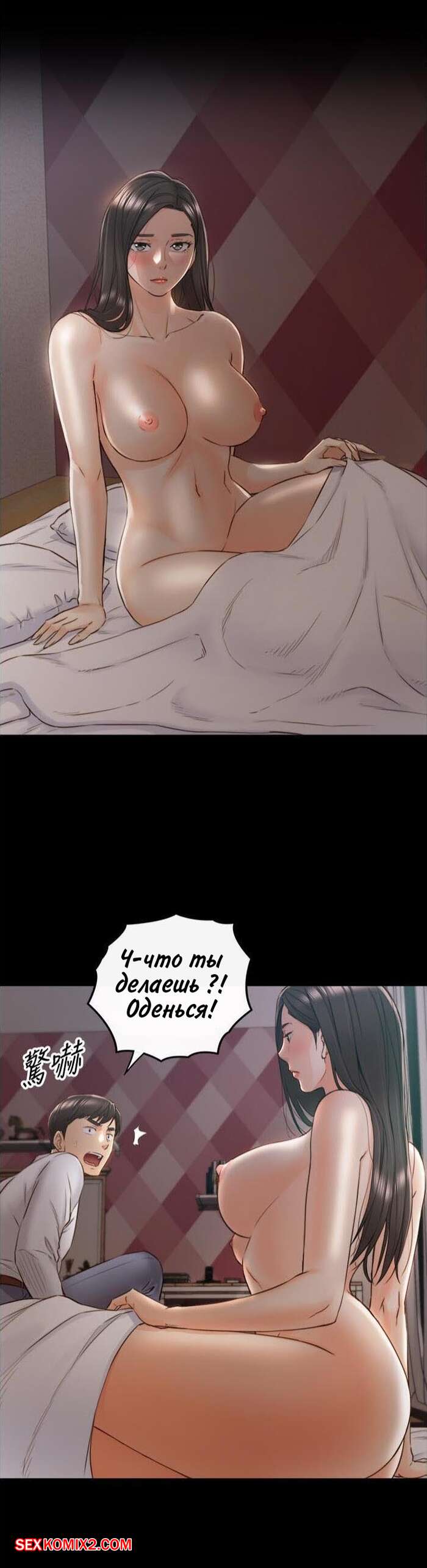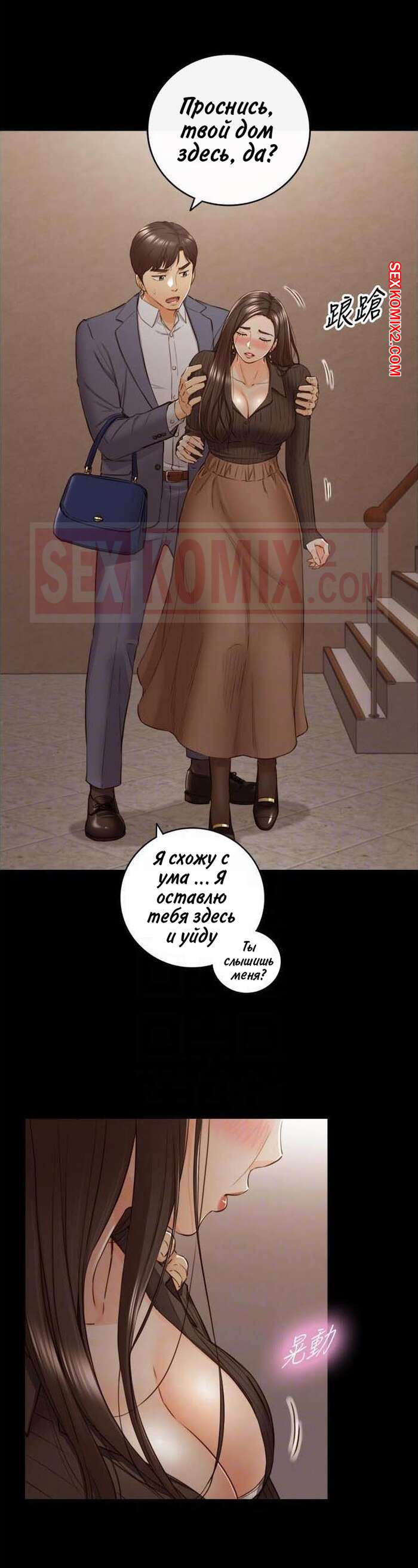 Порно комикс Молодой босс. Часть 94. Young boss Горячая красотка брюнетка вернулась с парнем домой и сразу разделась, чтобы лечь спать. Она не могла уснуть от возбуждения, поэтому решила повеселиться с парнем и стала тянуться к его члену.