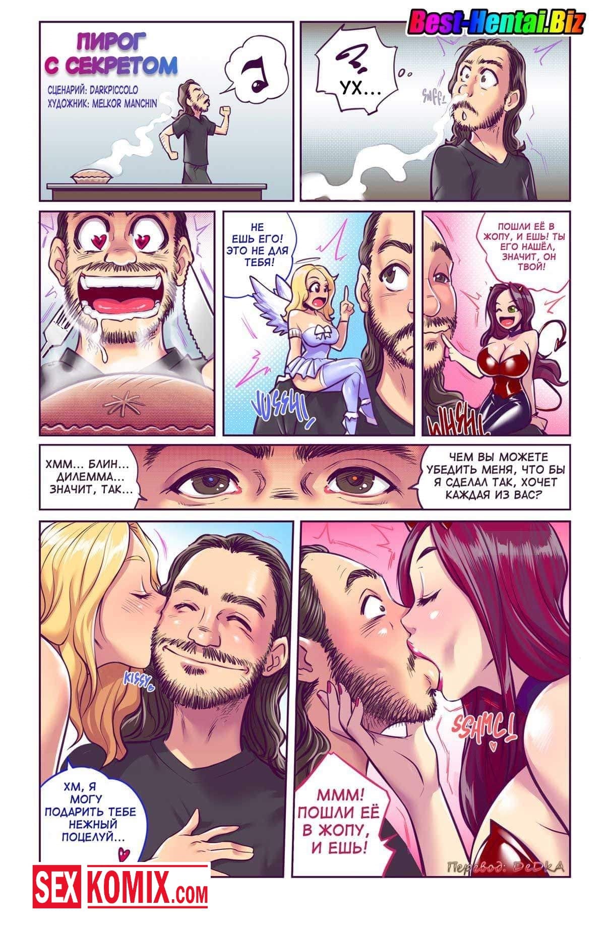 Порно комикс Загадочный пирог. Зайдя на кухню парень обнаружил свежеиспеченный пирог на столе и он захотел его попробовать, не задумываясь о том откуда он там взялся, ведь живёт он один. Как только эта мысль промелькнула в его голове, на плечах возникли две сексуальные девушки. Одна была ангелом а другая дьяволом, они убеждали парня каждая в своем. Одна хотела, чтобы тот пробовал пирог, а другая убеждала в обратном. Но парень сказал, что он послушает ту из девушек, которая хорошенько с ним трахница и сделает отличный миньет.