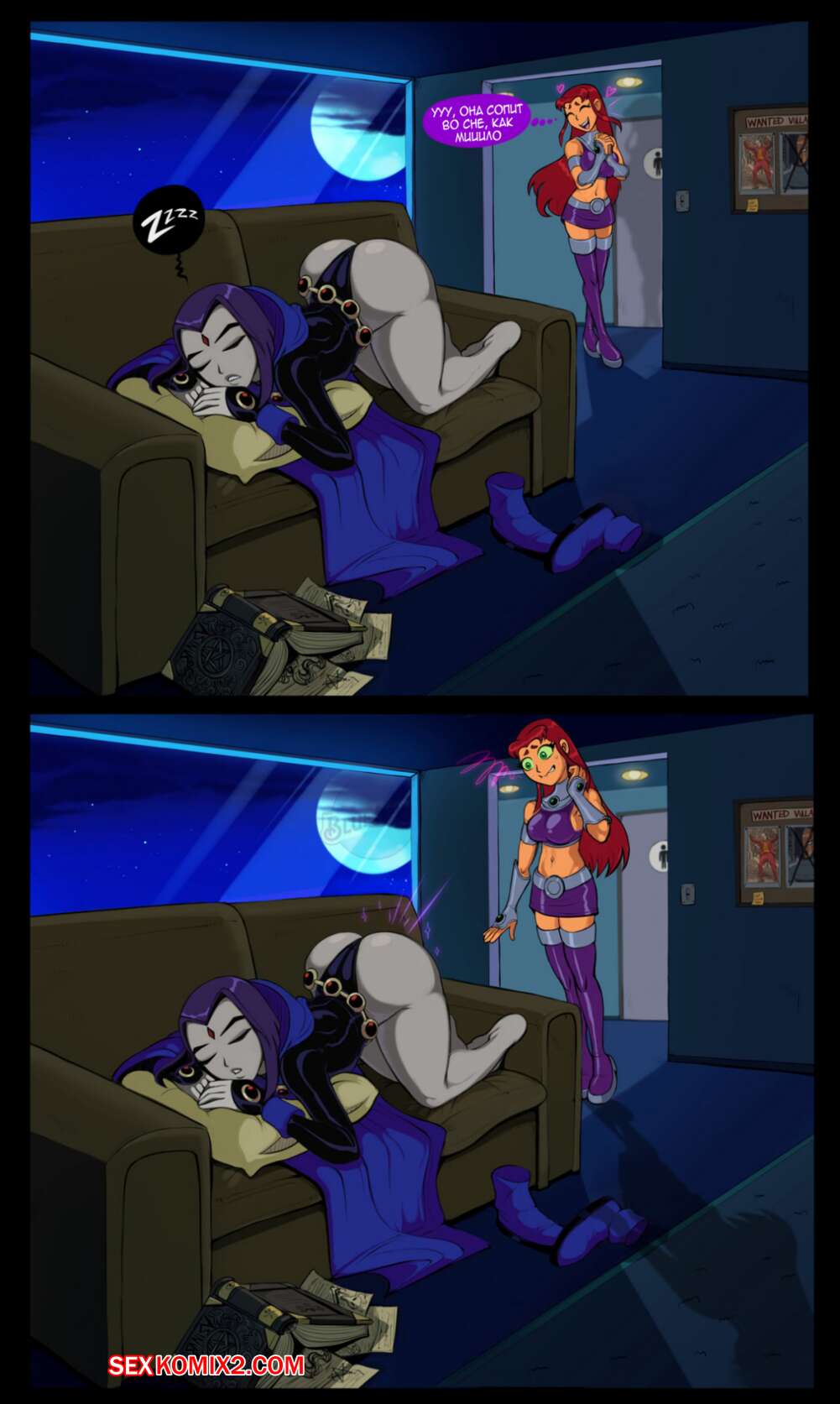 Порно комикс Титаны. Ravenous Горячая сисястая красотка с большим хуем застала свою подругу Рейвен спящей задницей к верху. Девушка стала ласкать пизденку подруги, разбудив ее, а затем дала отведать свой большой хуй.