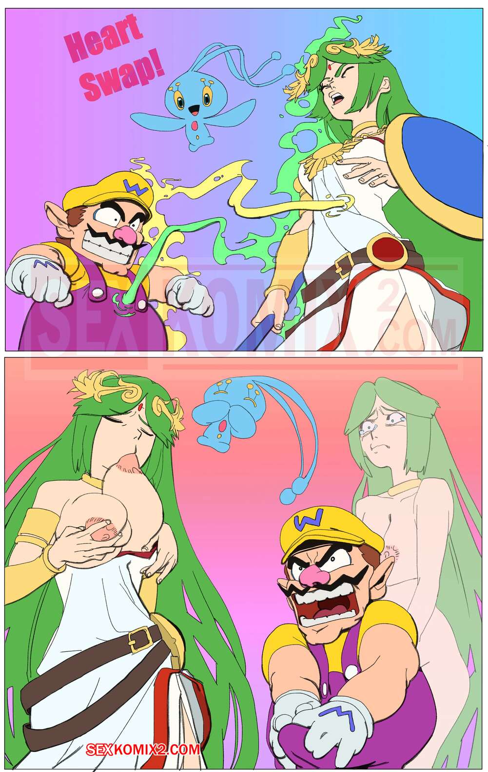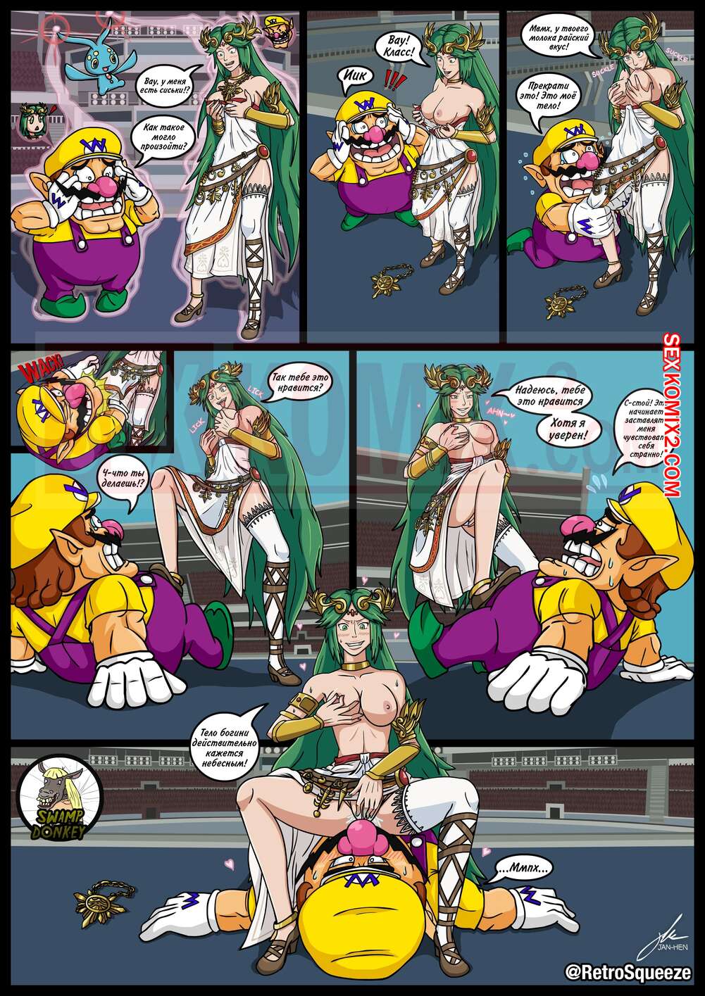 Порно комикс Марио. Palutena and Wario BodySwap. Mario Series. TSFSingularity Парнишка и молодая красотка с большими сиськами поменялись телами. Оказавшись в теле красотки, парень стал ласкать ее большие сиськи, а затем разделся и уселся на свой большой хуй.