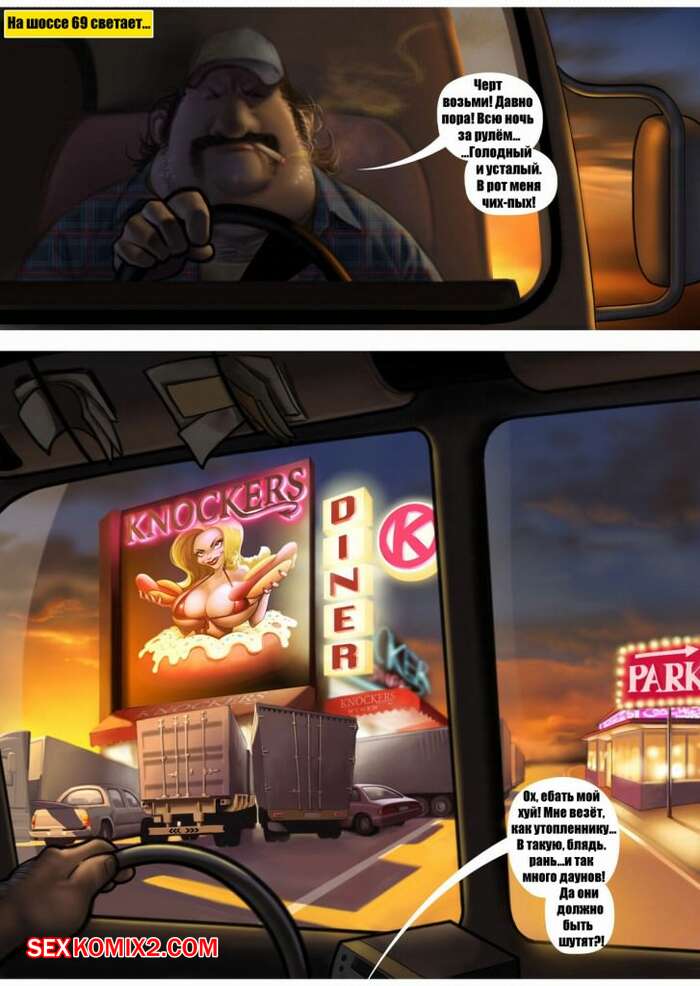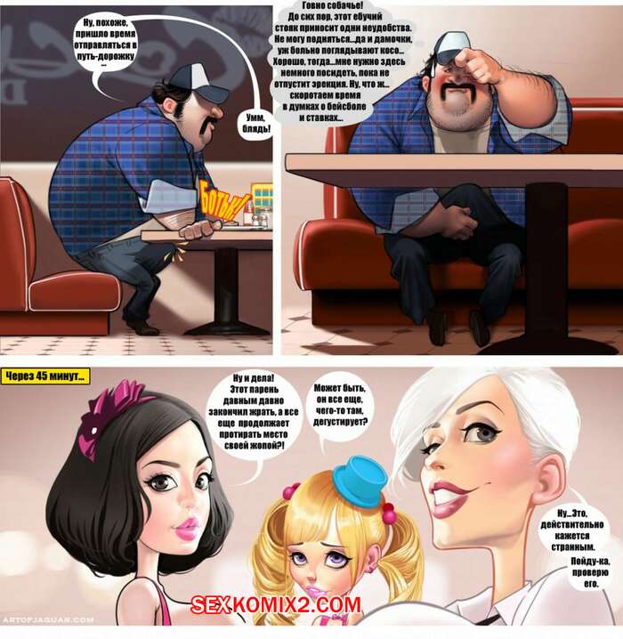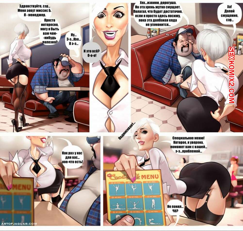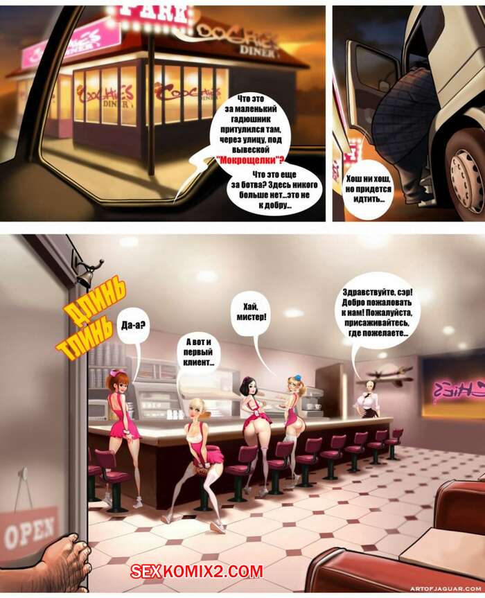 Порно комикс Яркая жизнь дальнобойщика. Jaguar Мужик дальнобойщик решил остановиться и перекусить в кафешке. Там он оказался в окружение нескольких красоток официанток, при виде которых у него сразу встал хуй. Он приметил себе одну молодую брюнеточку и решил с ней порезвиться.