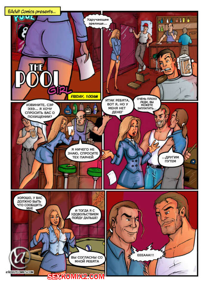 Порно комикс Бильярдная Два мужика засмотрелись на горячую милфу блондинку в бильярде. Они раздели ее и дали ей отсосать свои большие хуи, после чего хорошенько выебали ее на бильярдном столе.