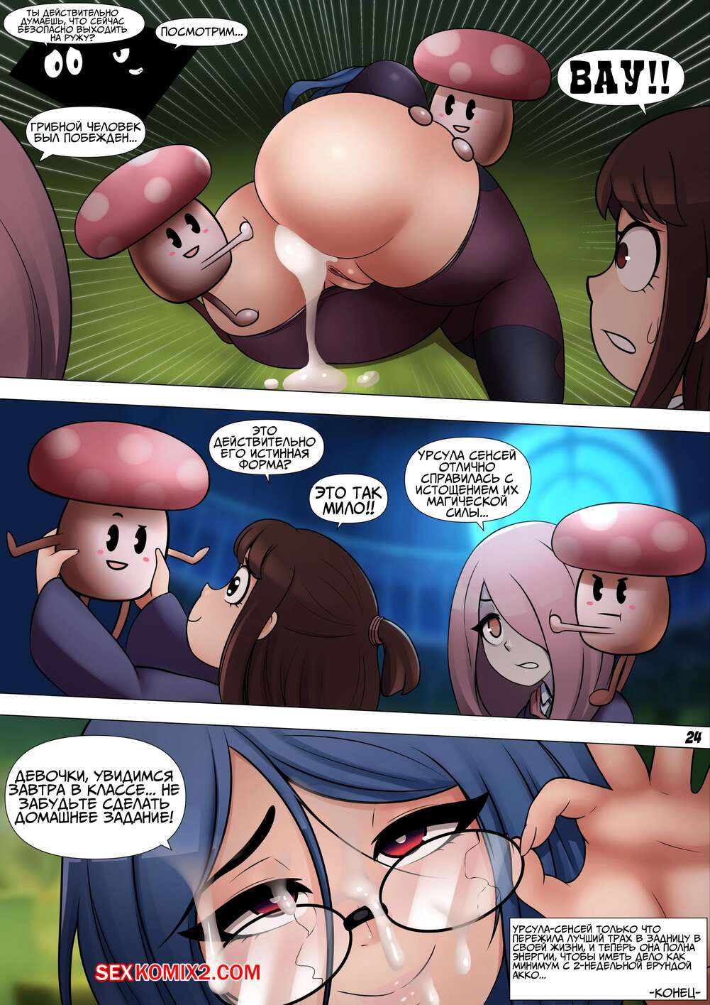 Порно комикс Моя учительница Урсула. My Teacher Ursula. Little Witch Academia Горячая сисястая брюнетка училка стала дрочить свою пизду на глазах учеников. Сучка была слишком возбуждена, поэтому стала отсасывать большие хуи парней, а затем дала им себя хорошенько выебать.