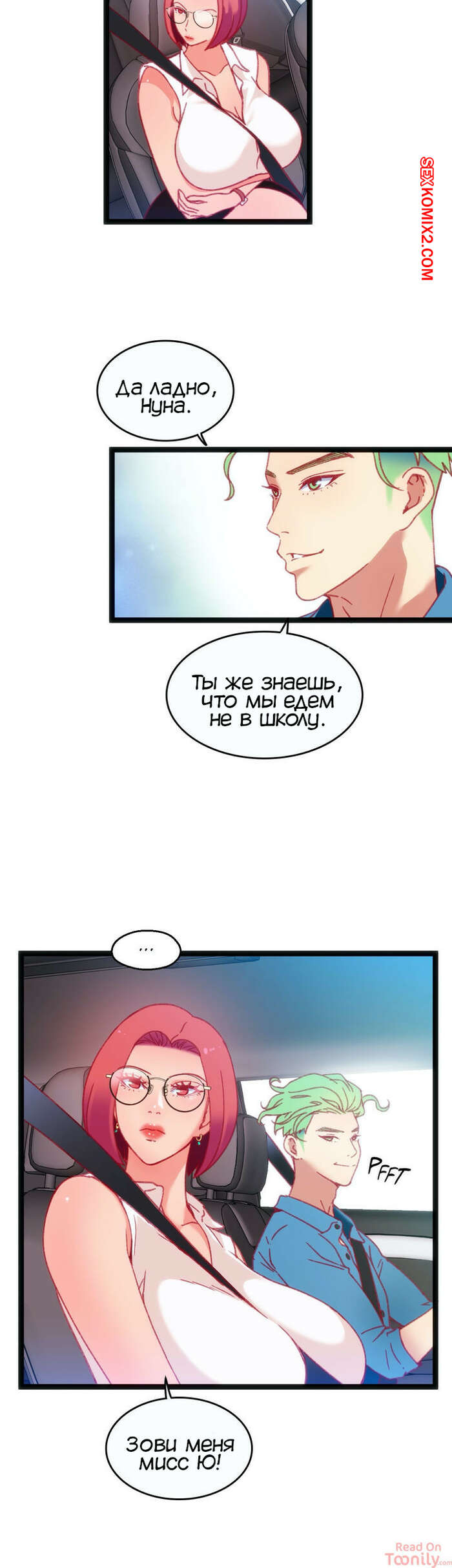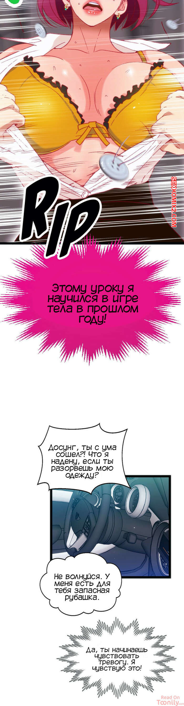 Порно комикс Игра с телом. Часть 21. The Body Game Парень встретил горячую сисястую брюнетку возле ее дома и предложил ей подвезти ее до школы. Она села к нему в тачку, но он повез ее на парковку, чтобы выебать ее в машине и сыграть в игру тела.