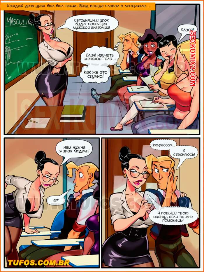 Порно комикс Факультет. Часть 10. Практическая анатомия. Tufos Парень отправился на урок с одними девушками. Училка решила рассказать на его примере о репродуктивной системе. Все девушки возбудились и они решили заняться групповой еблей.