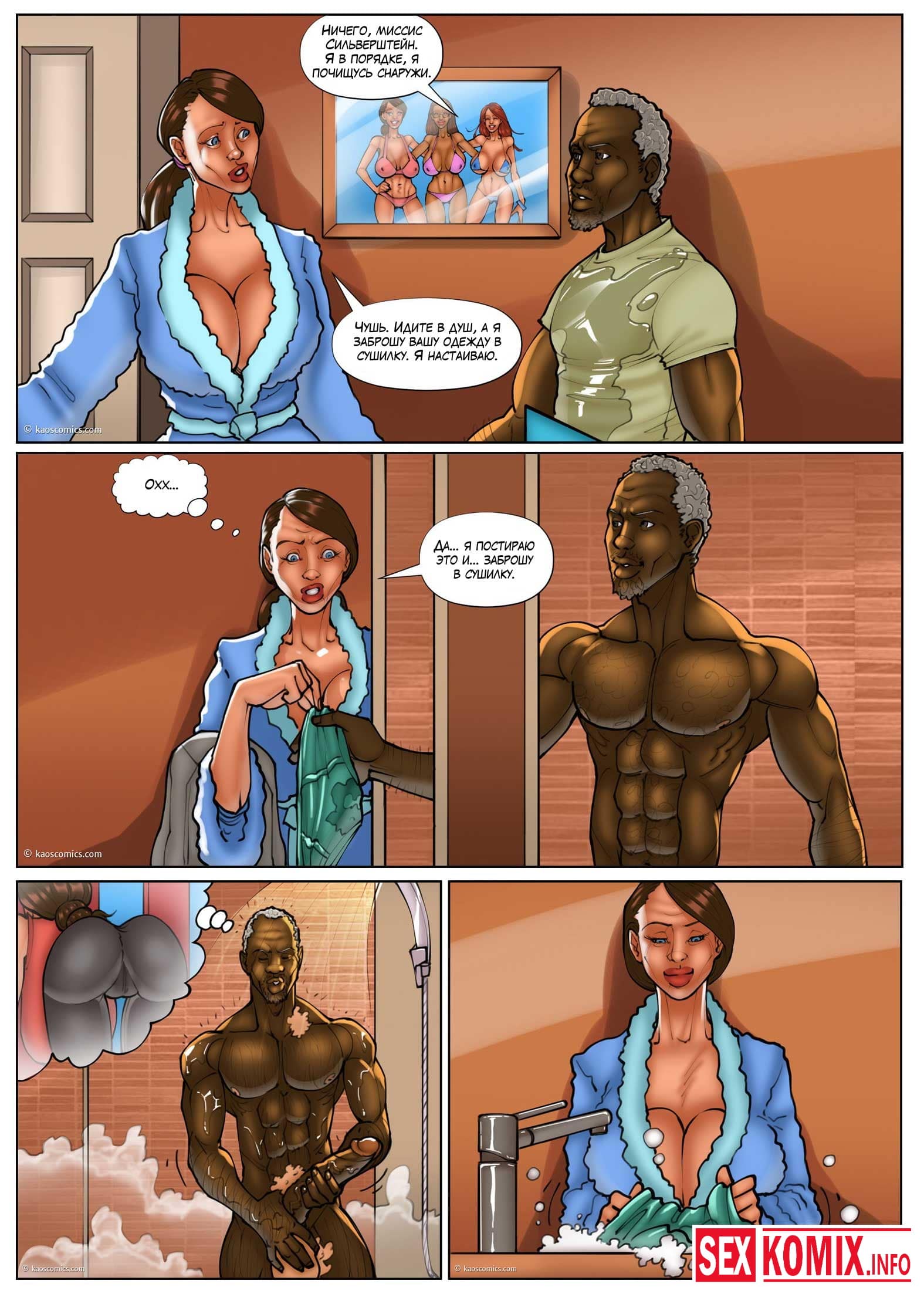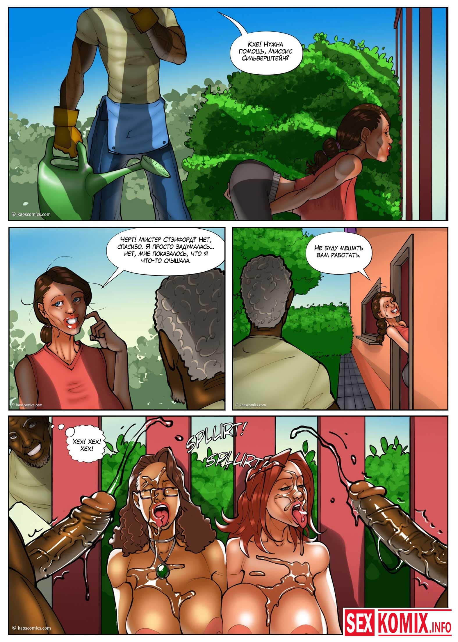 Порно комикс Белые жёны и чёрные садовники. Часть 3. Сексуальная девушка лежала на шезлонге в своем дворе и услышала какие-то стоны за забором. Она выглянули и сала свидетельницей как двое чернокожих садовников трахали хозяйку дома. Девушка возбудилась, пошла в дом достала свою секс игрушку и начала мастурбировать представляя себя на месте соседки.